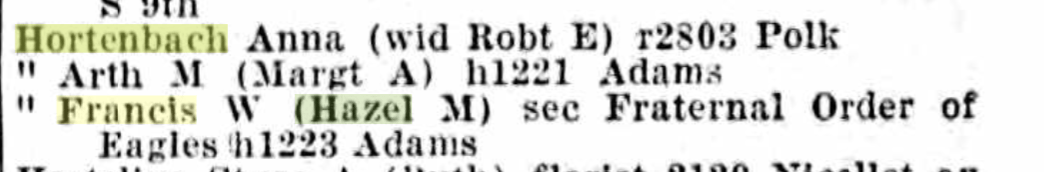 - Hortenbach Francis W (Hazel M) sec Fraternal Order of Eagles h1223 Adams.