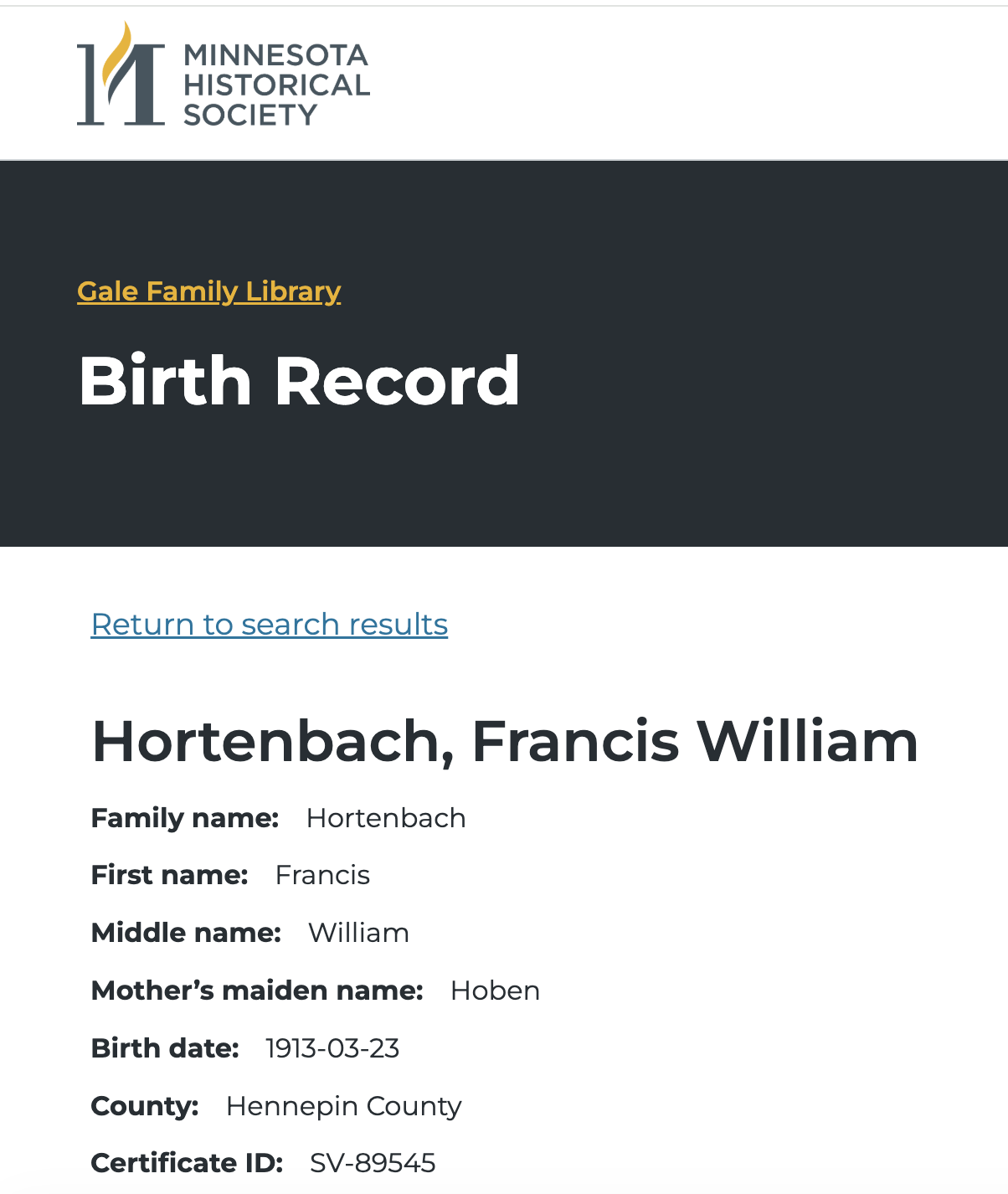 Francis William Hoban - Hortenbach werd geboren op 23 maart 1913 in Hennepin, Minnesota, USA als zoon van William H. Hoban en Alice B Moran.