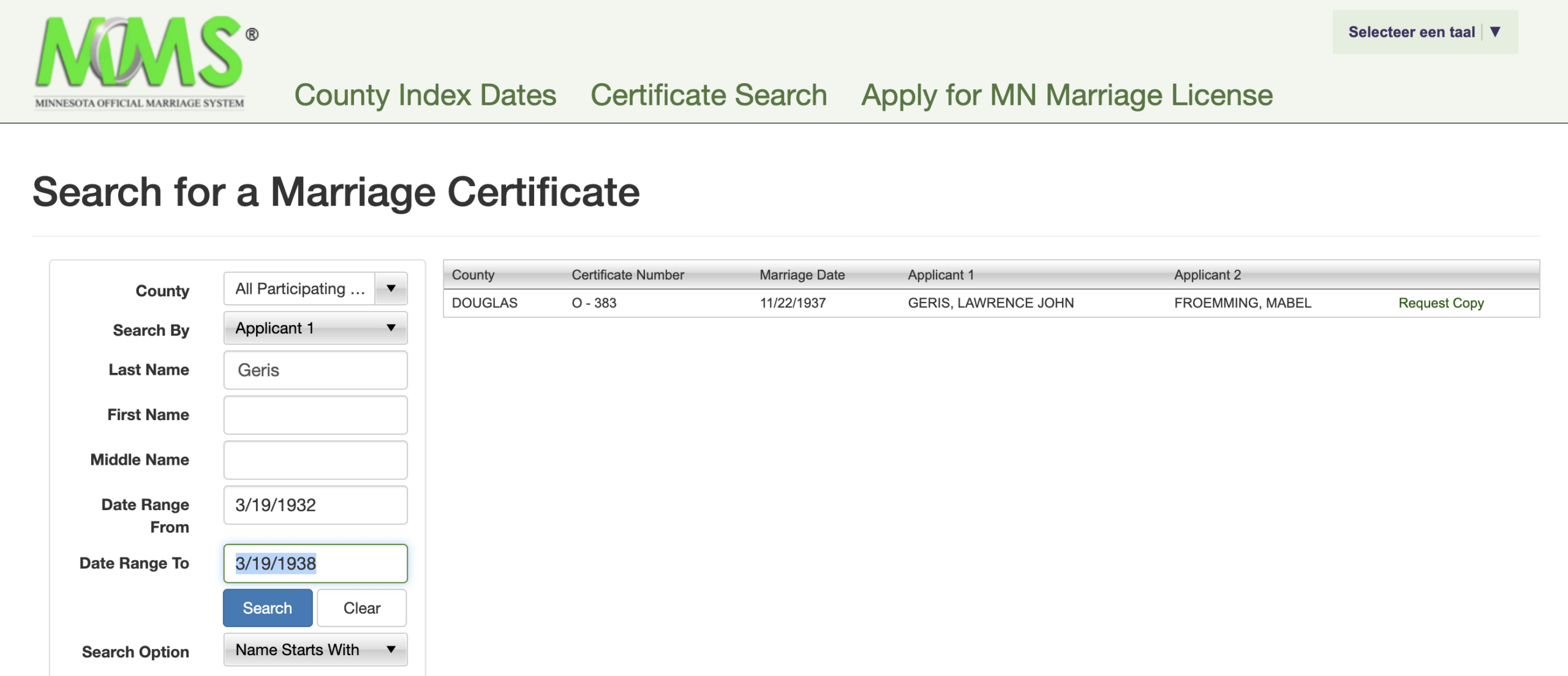 Burgerlijk huwelijk: 22 november 1937 in Douglas, Minnesota, USA