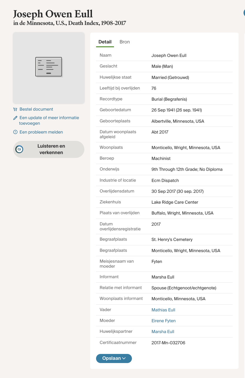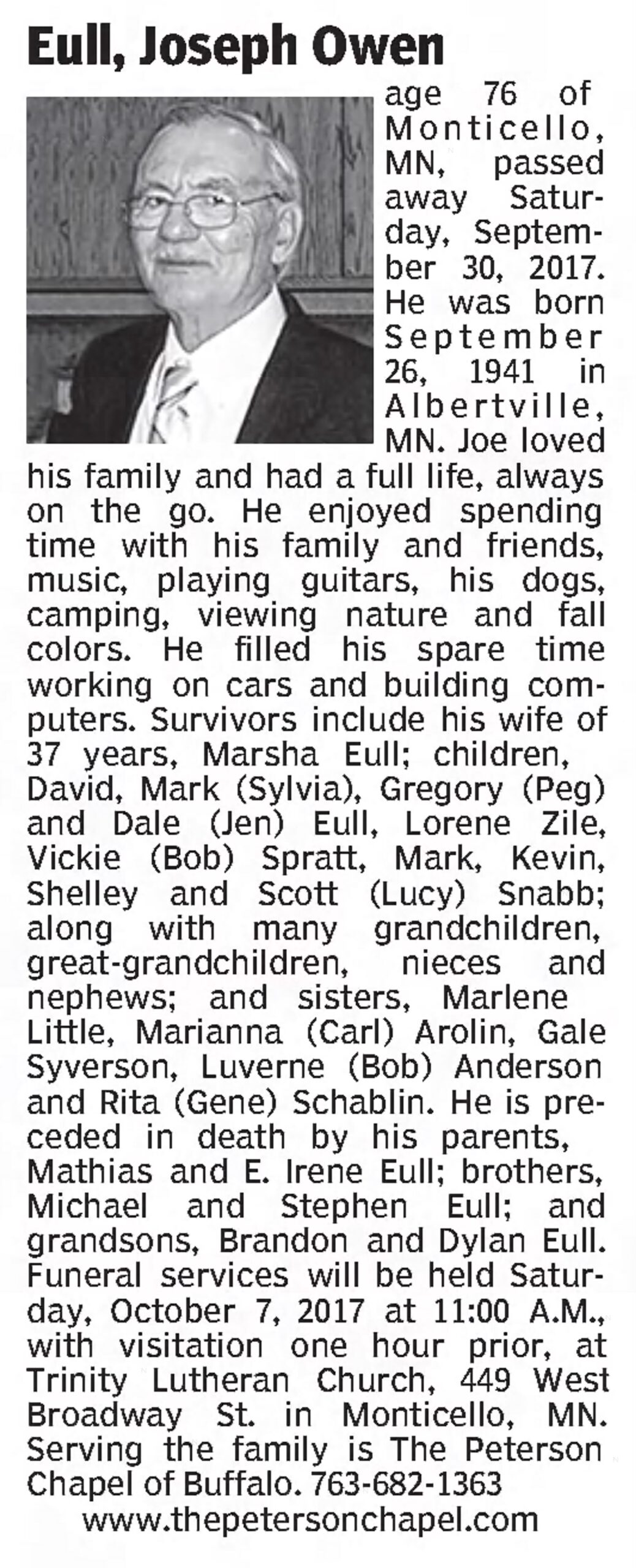 Eull, Joseph Owen, 76 jaar oud, uit Monticello, MN, is op zaterdag 30 september 2017 overleden. Hij werd geboren op 26 september 1941 in Albertville, MN. Joe hield van zijn familie en had een vol leven; hij was altijd in de weer. Hij genoot van de tijd met zijn familie en vrienden, van muziek, gitaar spelen, zijn honden, kamperen en het bekijken van de natuur en de herfstkleuren. In zijn vrije tijd sleutelde hij graag aan auto's en bouwde hij computers.