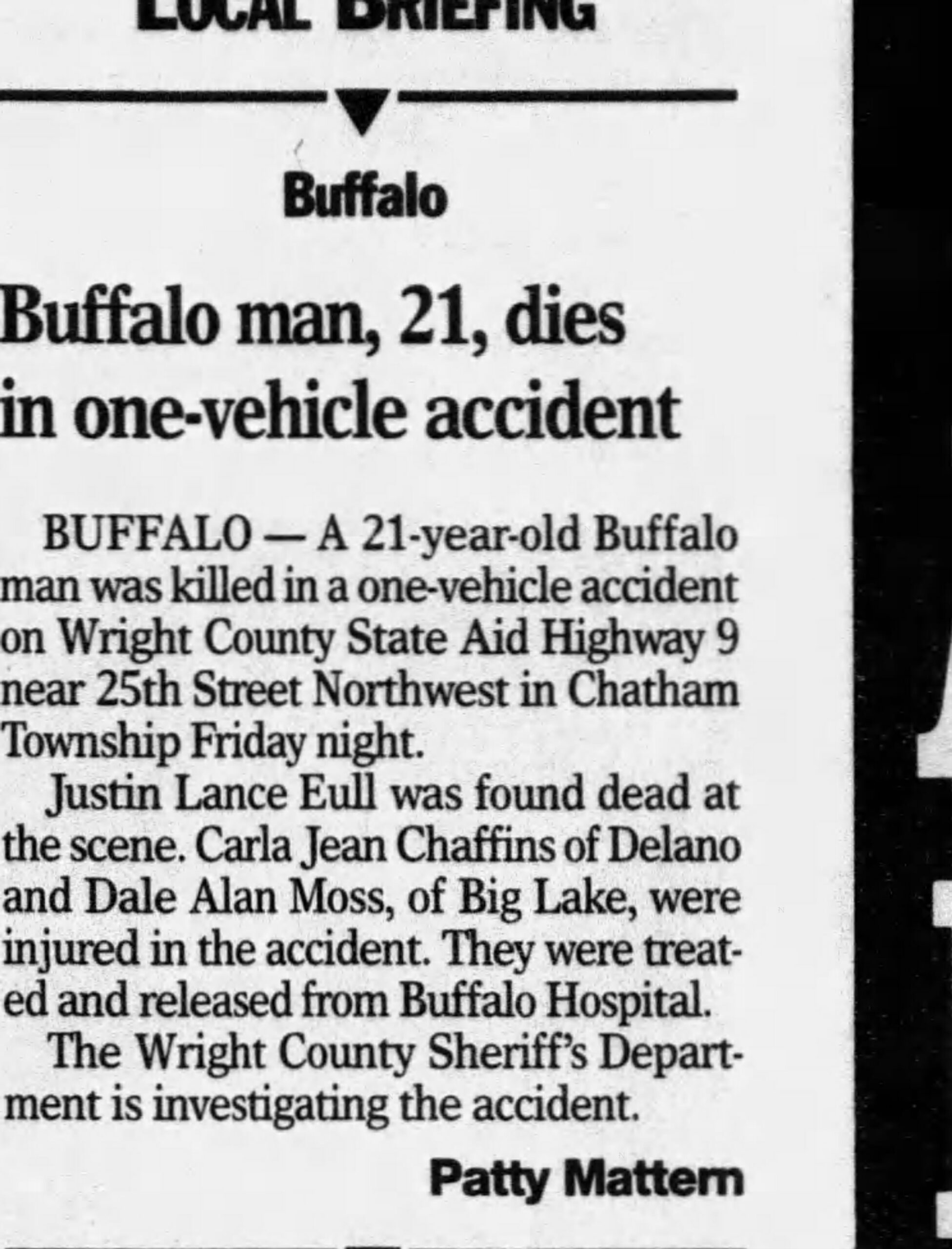 BUFFALO — Een 21-jarige man uit Buffalo is vrijdagavond omgekomen bij een eenzijdig ongeval op de Wright County State Aid Highway 9 nabij 25th Street Northwest in Chatham Township. Justin Lance Eull werd dood aangetroffen op de plaats van het ongeval. Carla Jean Chaffins uit Delano en Dale Alan Moss uit Big Lake raakten gewond bij het ongeval. Zij werden behandeld en ontslagen uit het Buffalo Hospital. De Wright County Sheriff's Department onderzoekt het ongeval. Patty Mattern