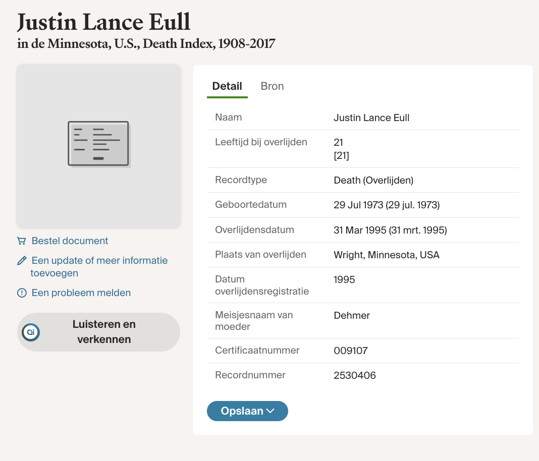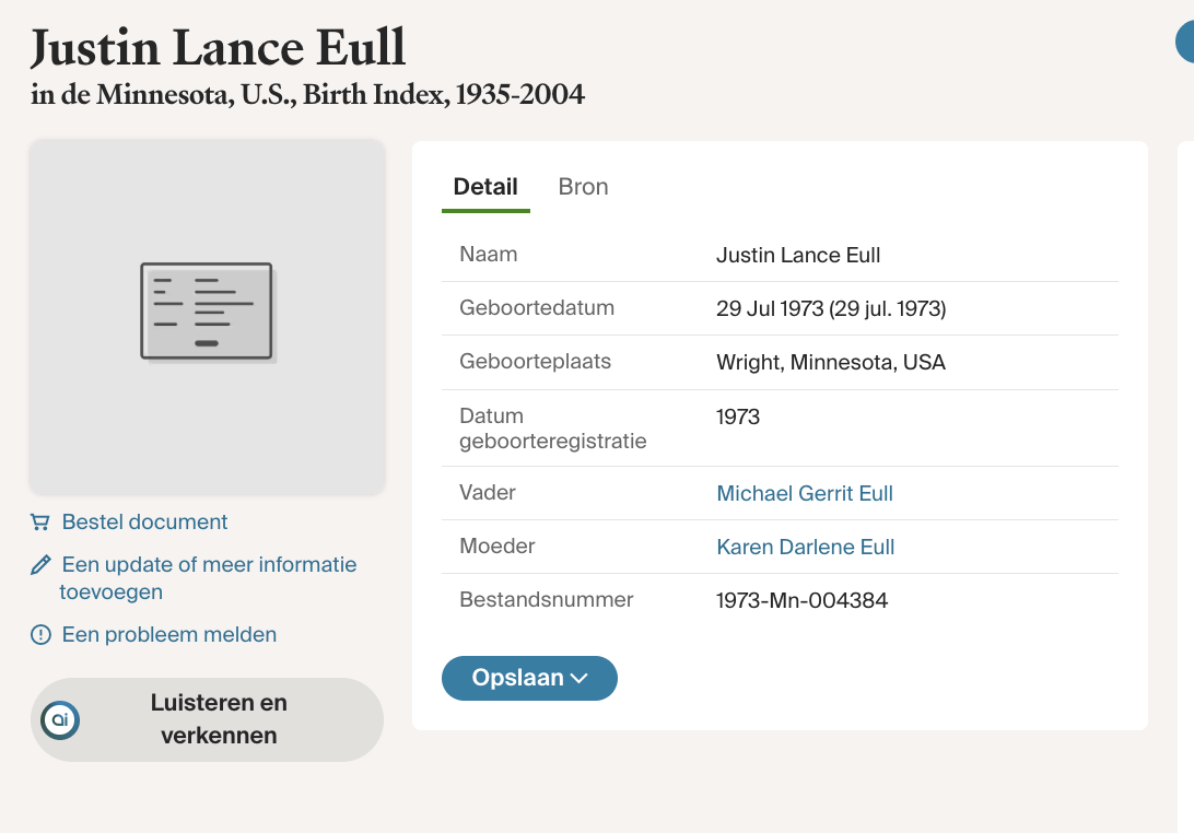 Justin Lance Eull werd geboren op 29 juli 1973 in Wright, Minnesota, USA als zoon van Michael Gerrit Eull en [Afgeschermd].