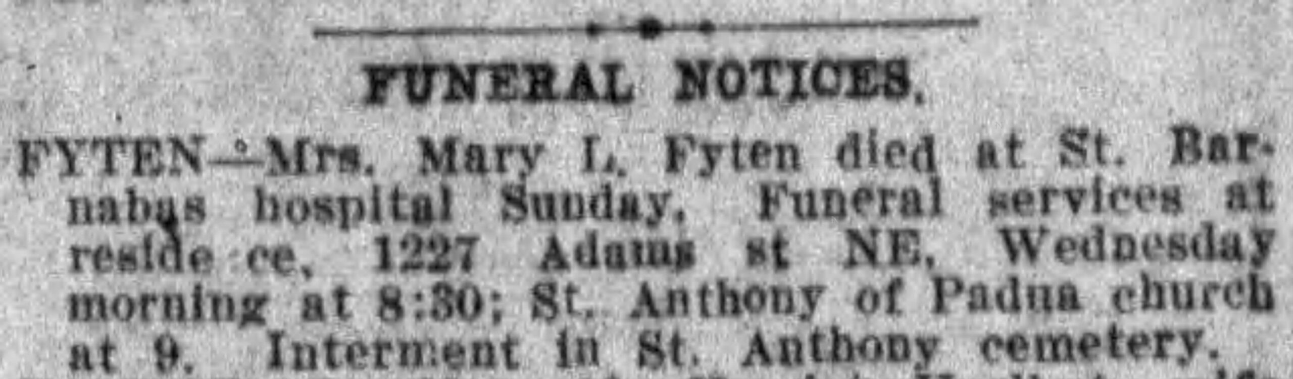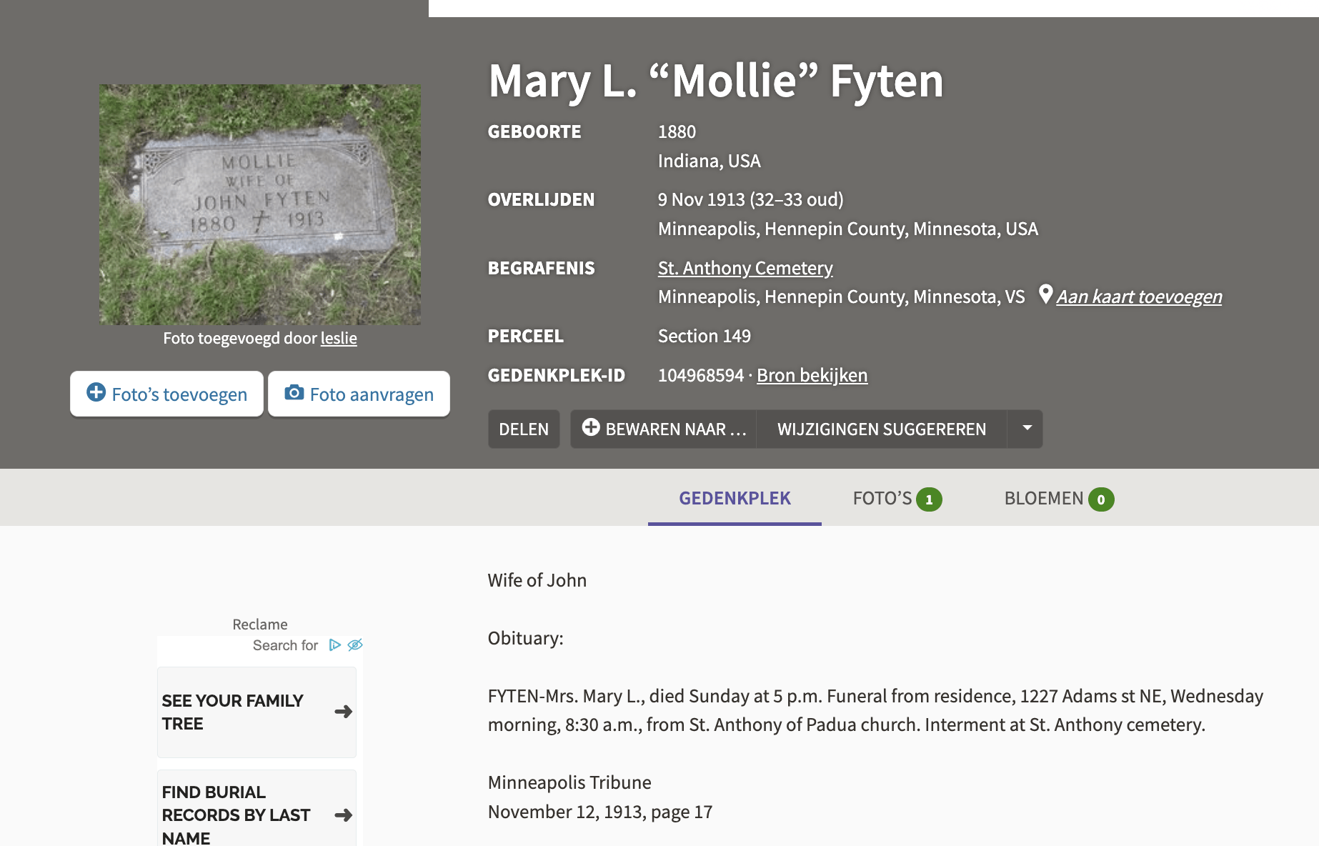Bron(nen): Obituary Minneapolis Journal (11 nov 1913), Grafsteen St. Anthony Cemetery.