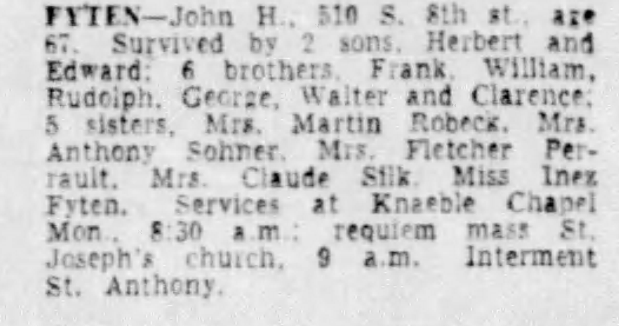 John Herbert Fyten werd geboren op 20 maart 1885 in Monticello, Minnesota, USA als zoon van Willem Hubertus Fyten en Mary Jasper.