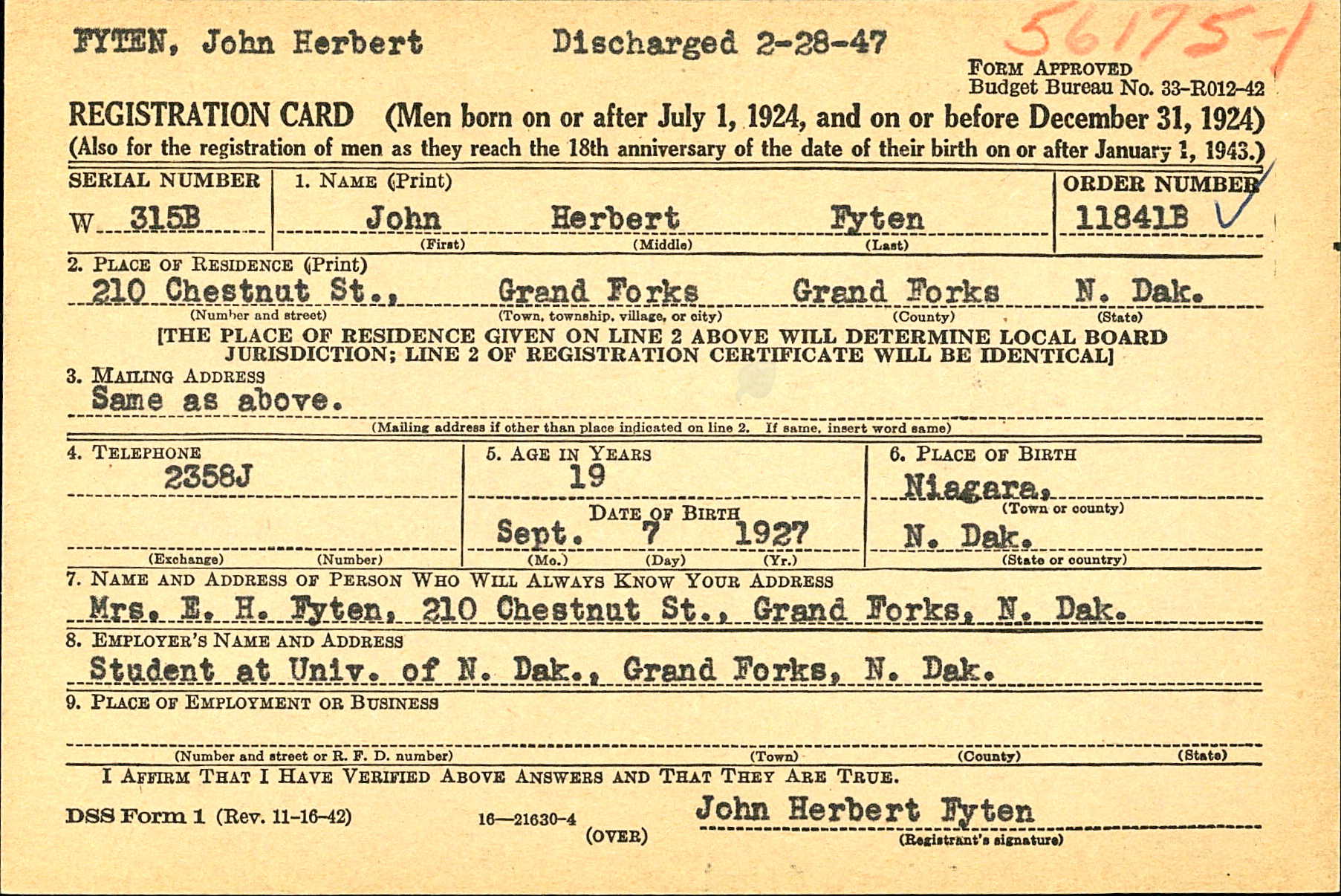 Zoon John Herbert Fyten wordt geboren in Niagara, North Dakota.