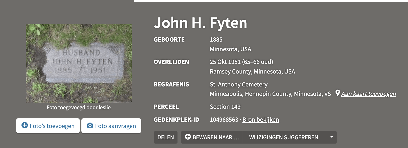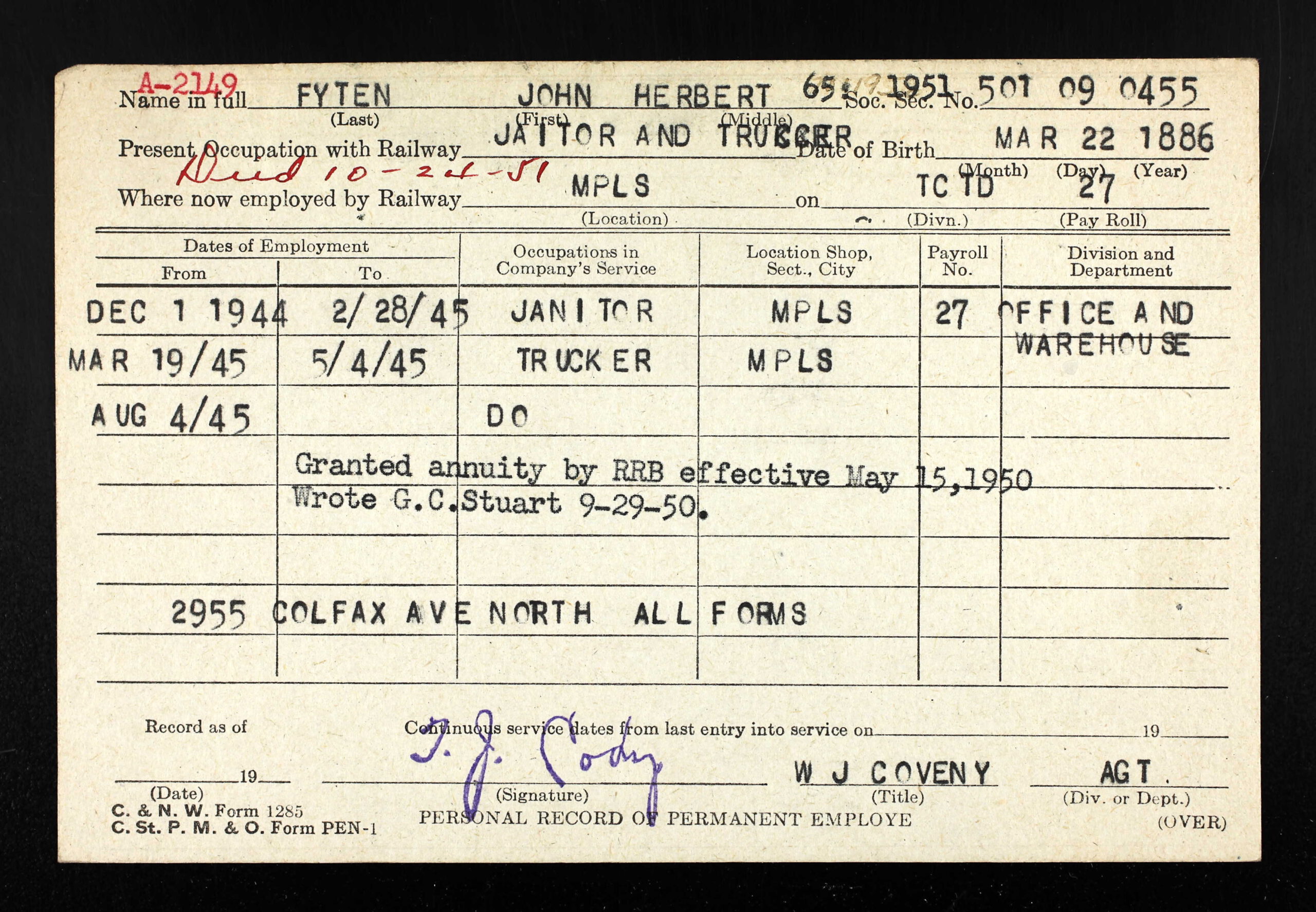 Bron(nen): Krantenartikel/Obituary (1951), Grafsteen St. Anthony Cemetery, annotatie op de Railway Employee Card.