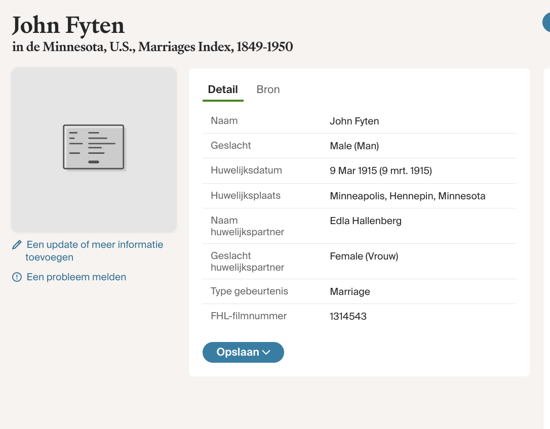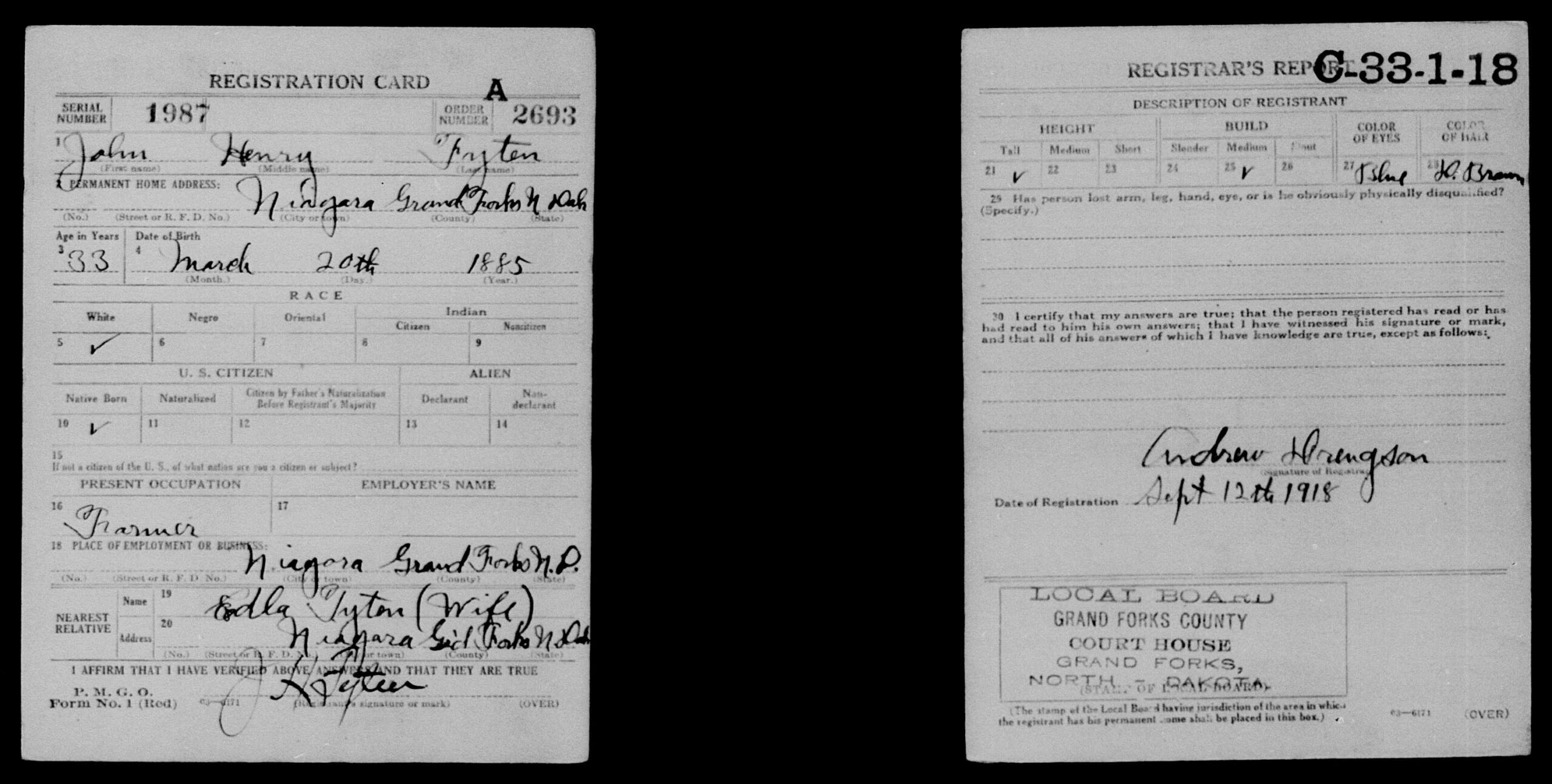 Geregistreerd onder de naam: John Henry Fyten. Hij werkt als zelfstandig boer (Farmer) en woont met zijn vrouw Edla in Niagara, Grand Forks County, North Dakota.