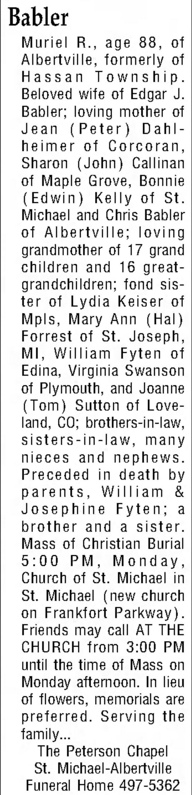 Babler Muriel R., 88 jaar oud, uit Albertville, voorheen uit Hassan Township. Geliefde echtgenote van Edgar J. Babler; liefhebbende moeder van Jean (Peter) Dahlheimer uit Corcoran, Sharon (John) Callinan uit Maple Grove, Bonnie (Edwin) Kelly uit St. Michael en Chris Babler uit Albertville; liefhebbende grootmoeder van 17 kleinkinderen en 16 achterkleinkinderen; dierbare zus van Lydia Keiser uit Mpls, Mary Ann (Hal) Forrest uit St. Joseph, MI, William Fyten uit Edina, Virginia Swanson uit Plymouth, en Joanne (Tom) Sutton uit Loveland, CO; zwagers, schoonzussen, vele neven en nichten. Voorgegaan in de dood door ouders, William & Josephine Fyten; een broer en een zus. Mis van christelijke begrafenis om 17:00 uur, maandag, Kerk van St. Michael in St. Michael (nieuwe kerk aan de Frankfort Parkway). Vrienden kunnen de familie condoleren IN DE KERK vanaf 15:00 uur tot aan de mis op maandagmiddag. In plaats van bloemen hebben donaties de voorkeur. De dienst wordt verzorgd door... The Peterson Chapel St. Michael-Albertville Funeral Home 497-5362.