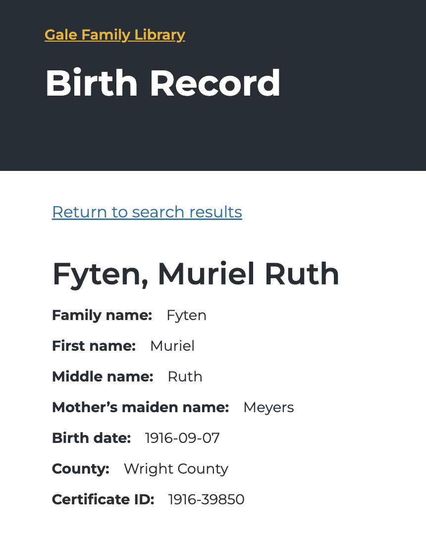 Muriel Ruth Fyten werd geboren op 7 september 1916 in Wright, Minnesota, USA als zoon van William Matthew Fyten en Josephine Meier.