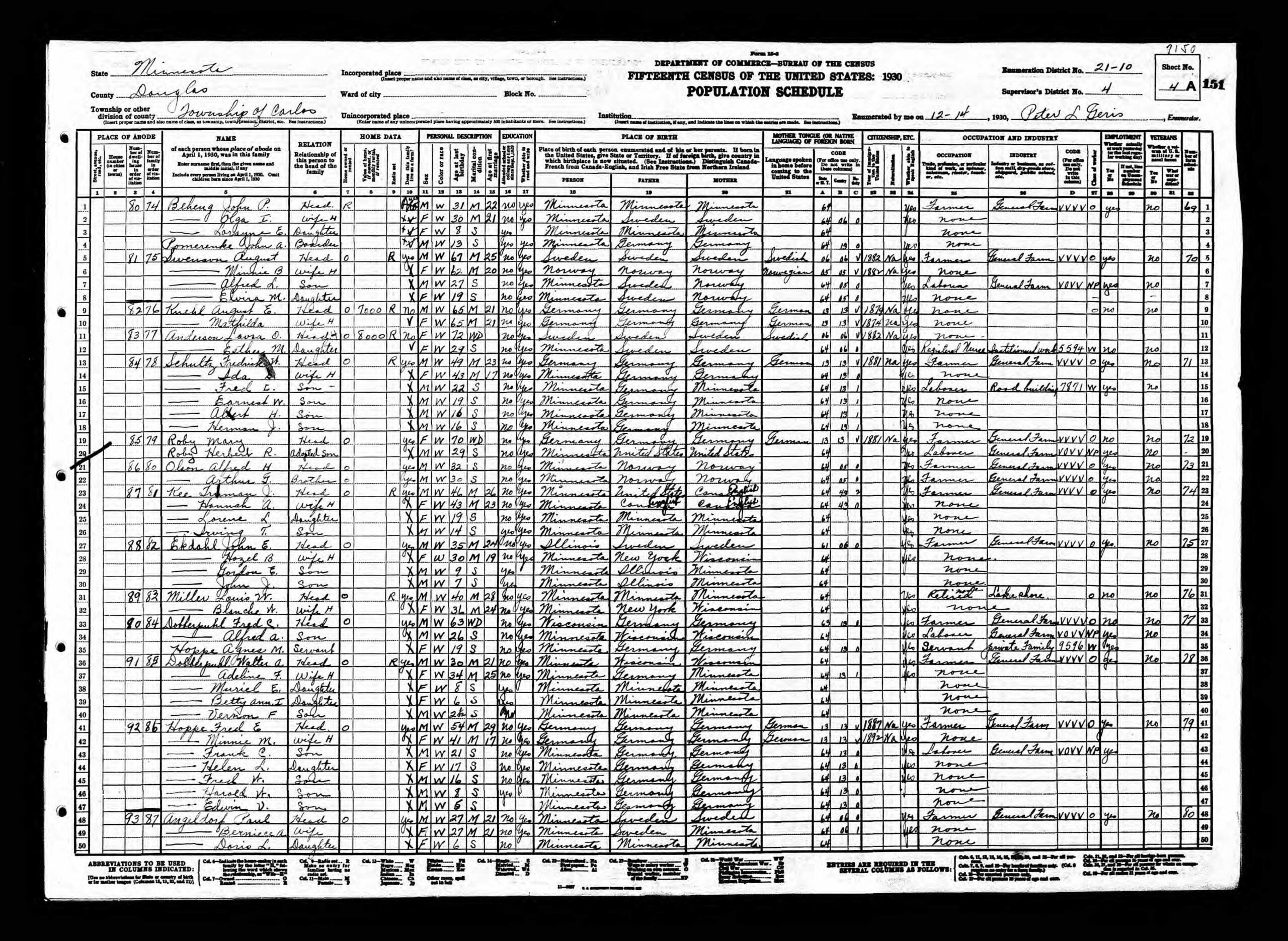 12-14 april 1930: John (31 jaar) is nu zelfstandig boer en huurt een boerderij in Carlos Township. Hij woont met zijn vrouw Olga (30), dochter Lorrayne (8) en een 13-jarige kostganger. Het gezin bezit een radio. Opvallend: de census wordt afgenomen door zijn oom, Peter L. Geris.