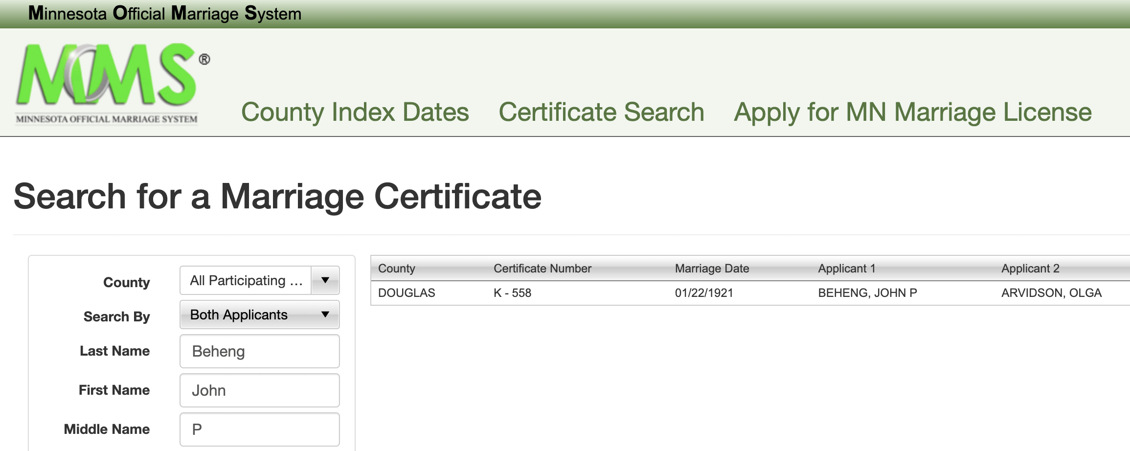 22 januari 1921: John trouwt op 21-jarige leeftijd met Olga E. Arvidson in Douglas County, Minnesota.