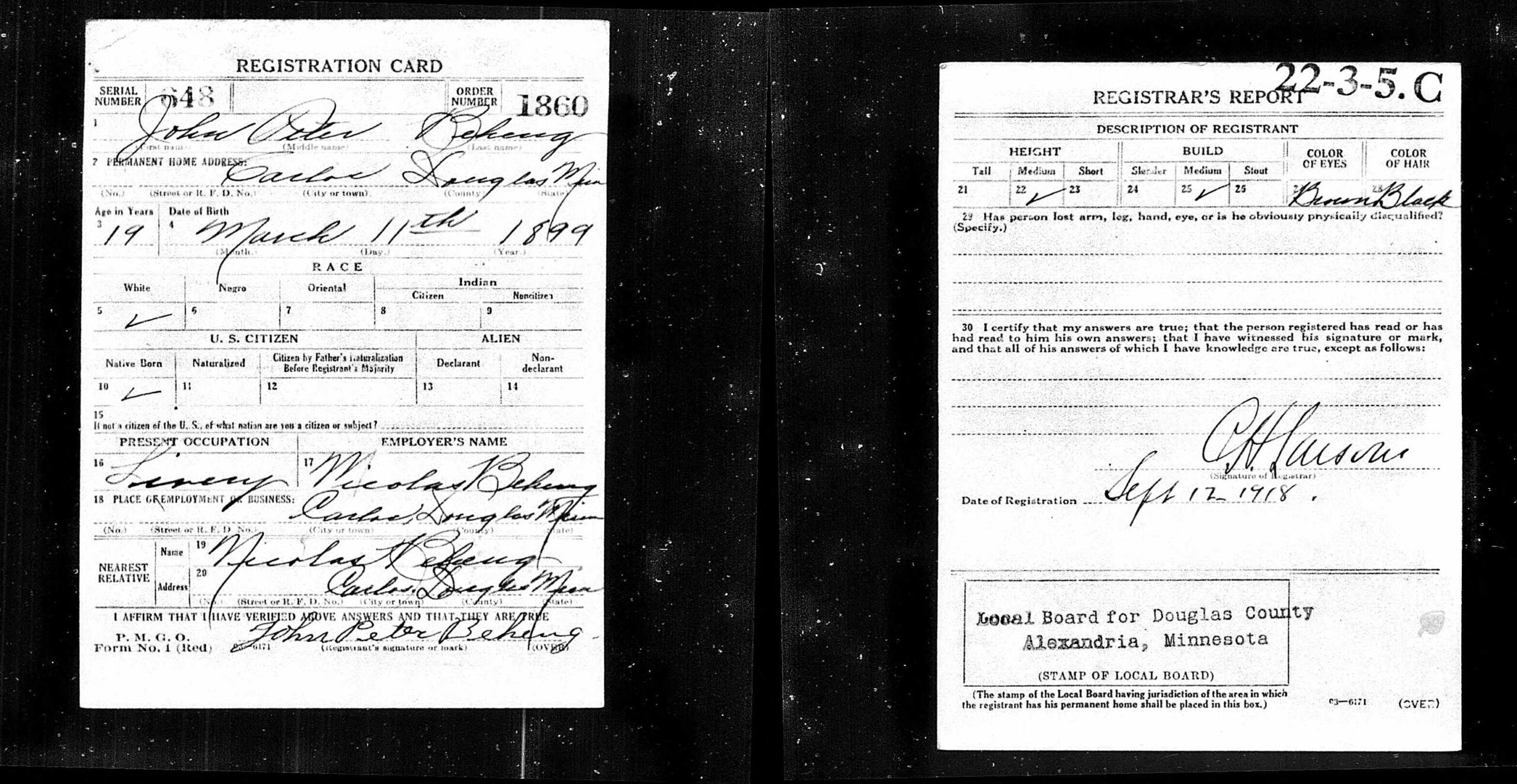 12 september 1918: John (19 jaar) registreert zich voor de dienstplicht van de Eerste Wereldoorlog. Hij is ongehuwd, slank, van gemiddelde lengte en heeft bruine ogen en zwart haar. Hij woont in Carlos en werkt in het paarden- en voertuigenverhuurbedrijf (livery) van zijn vader Nicholas.