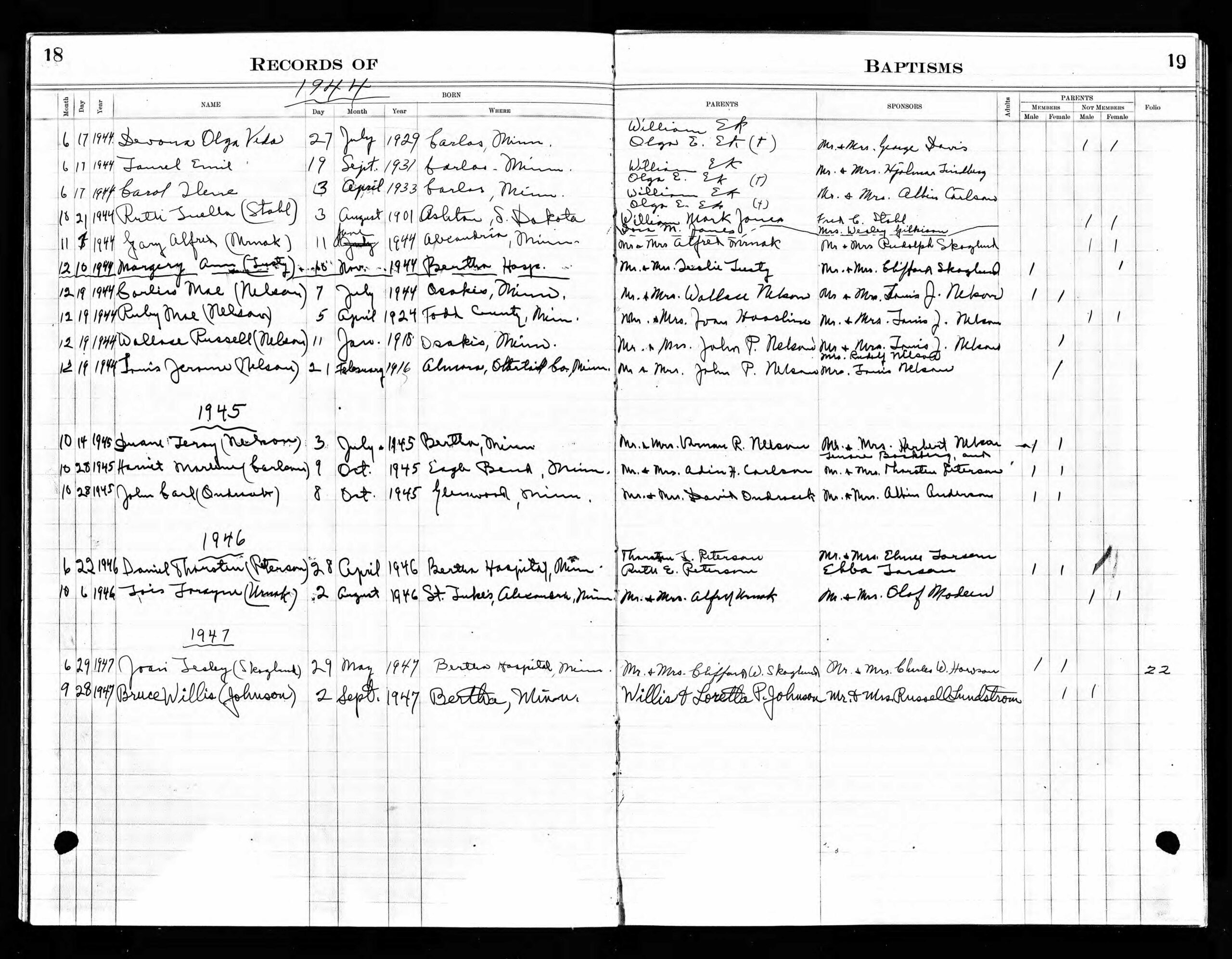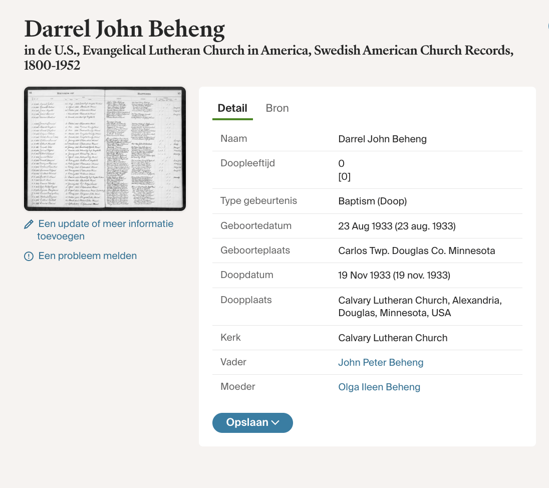 19 november 1933: Darrel wordt gedoopt. Zijn oom en tante (Henry Beheng en zijn vrouw) zijn de doopgetuigen.