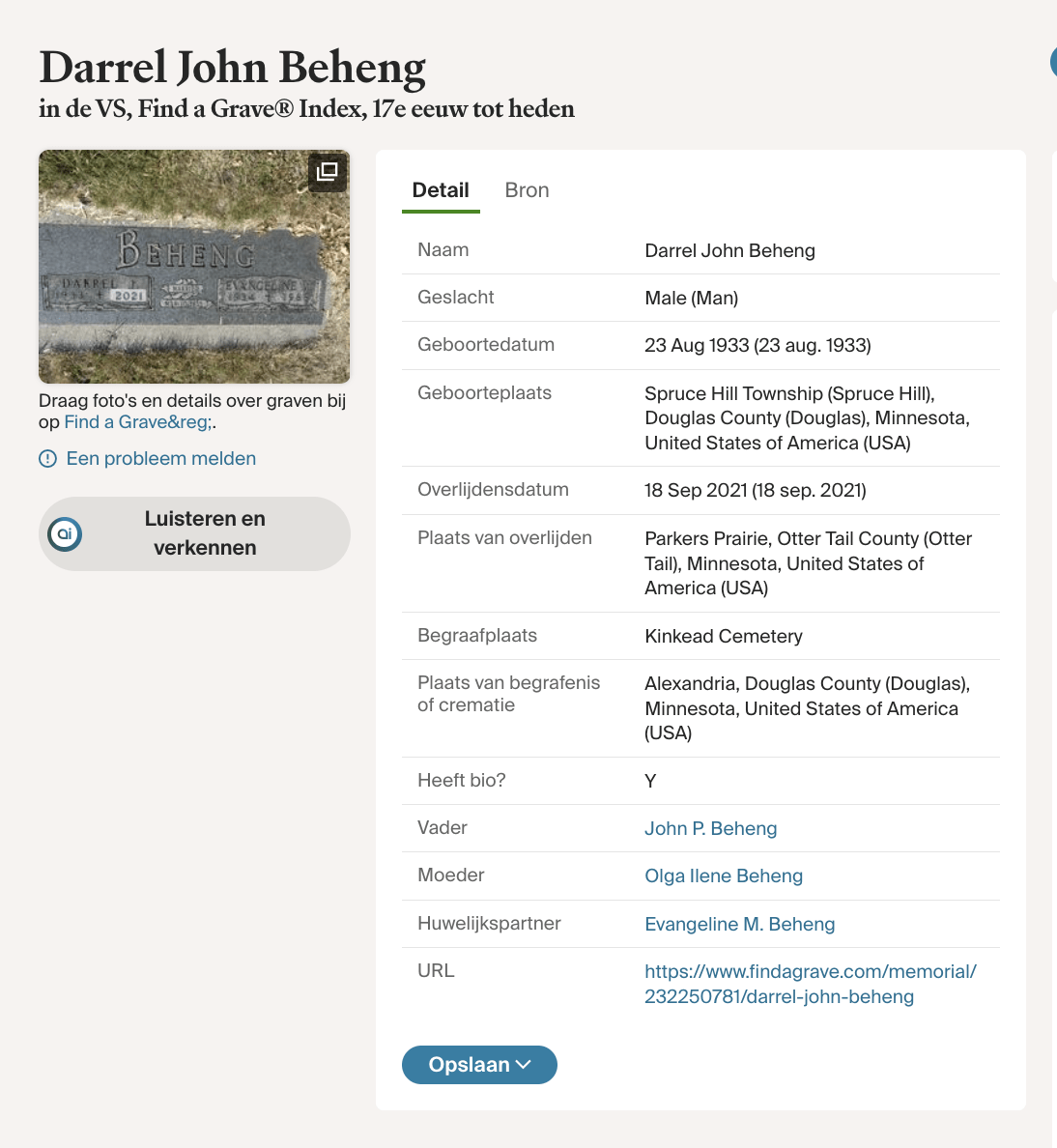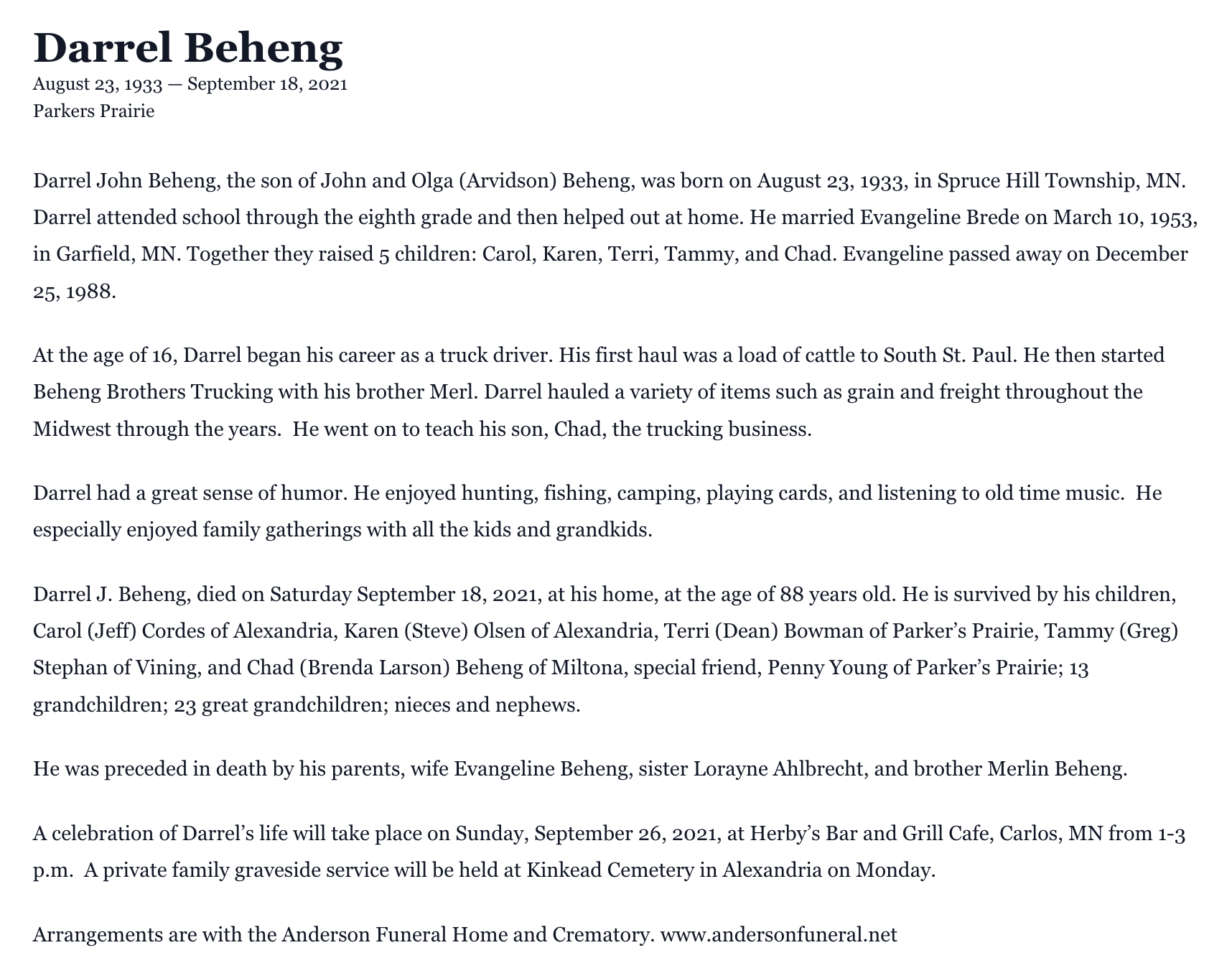 18 september 2021: Darrel John Beheng overlijdt op 88-jarige leeftijd thuis in Parkers Prairie, Minnesota. Hij laat 5 kinderen, 13 kleinkinderen en 23 achterkleinkinderen na.
