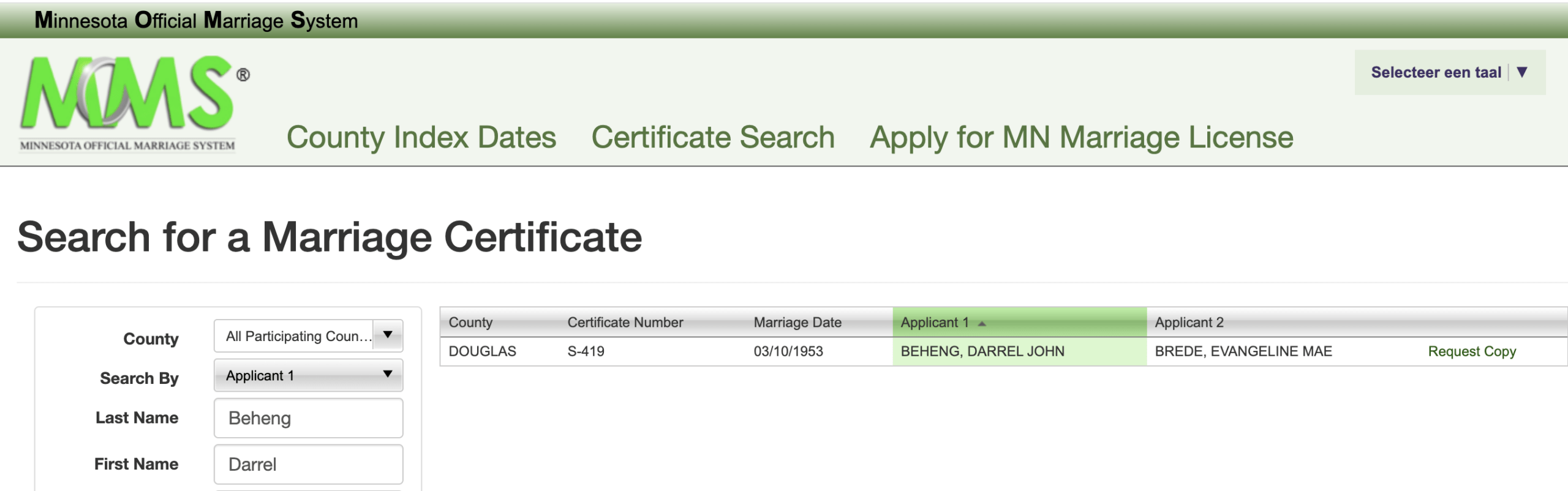 Bronnen: Minnesota Official Marriage System, Inscriptie op grafsteen.
