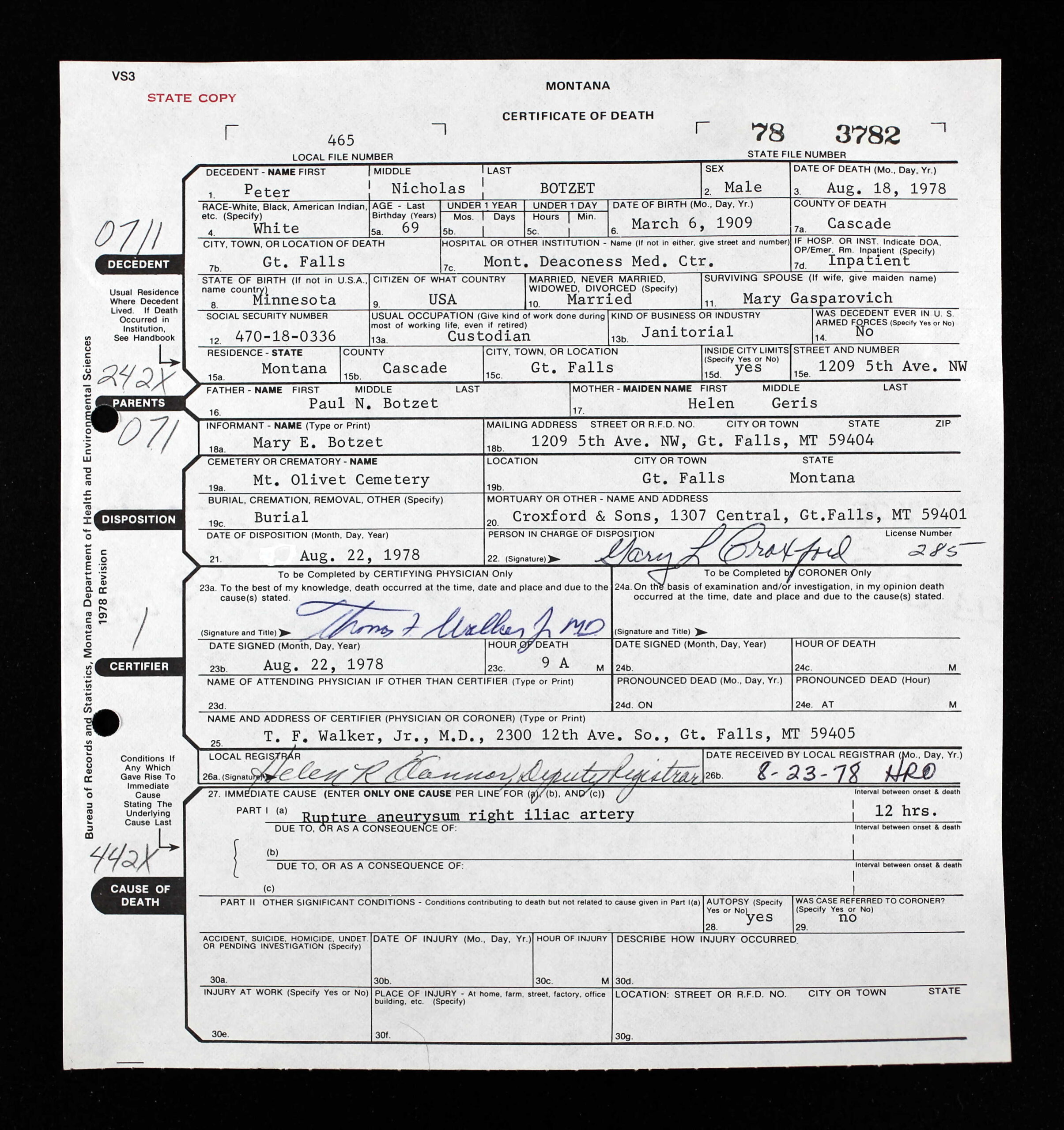 Overlijden: 18 augustus 1978 in Great Falls, Montana, USA