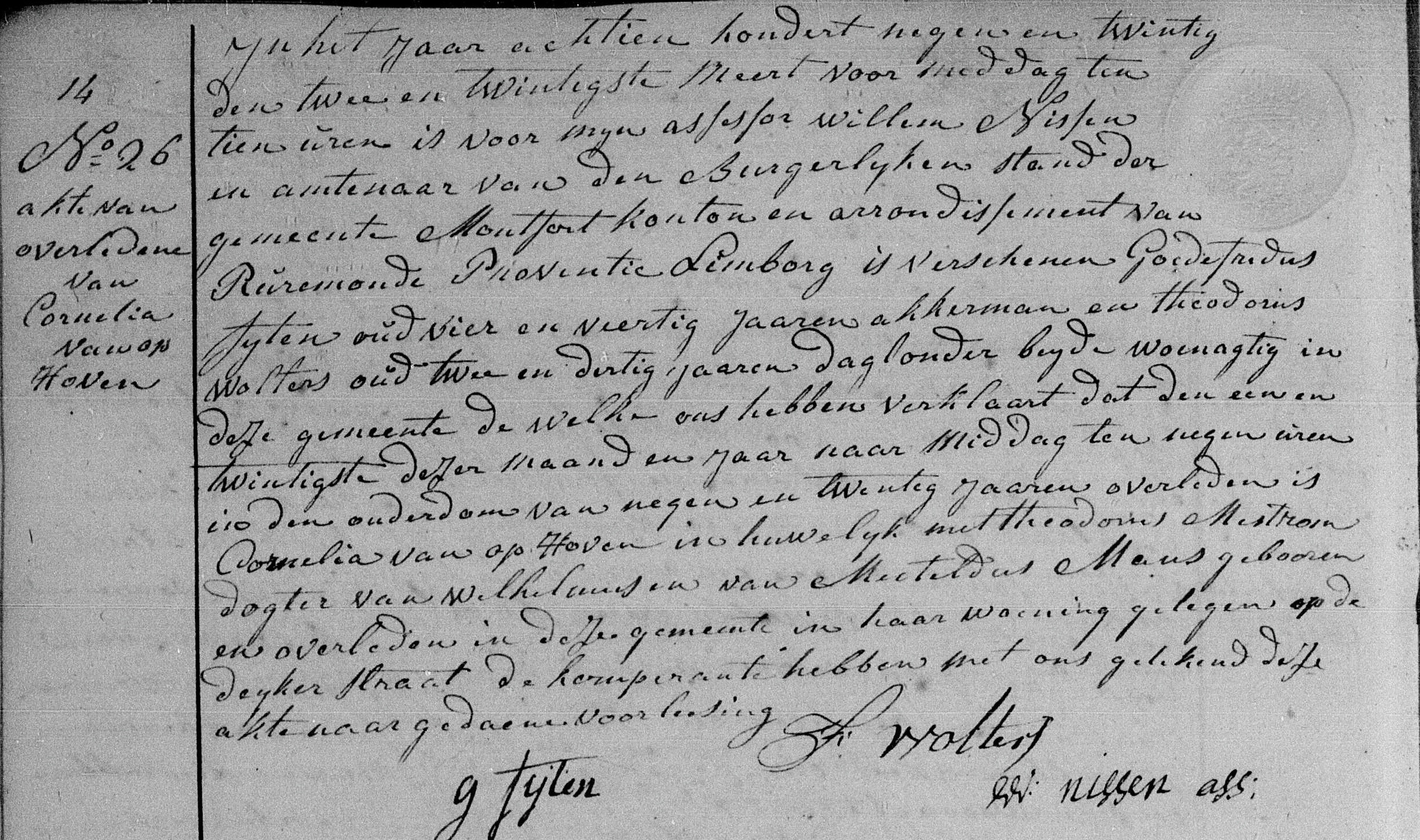 Cornelia van Ophoven, geboren op 13 december 1799 te Montfort, dochter van Wilhelmus van Ophoven en Mechtildis Mans; trouwt met Theodorus Mestrom voor de wet op 14 april 1823 te Montfort✔.