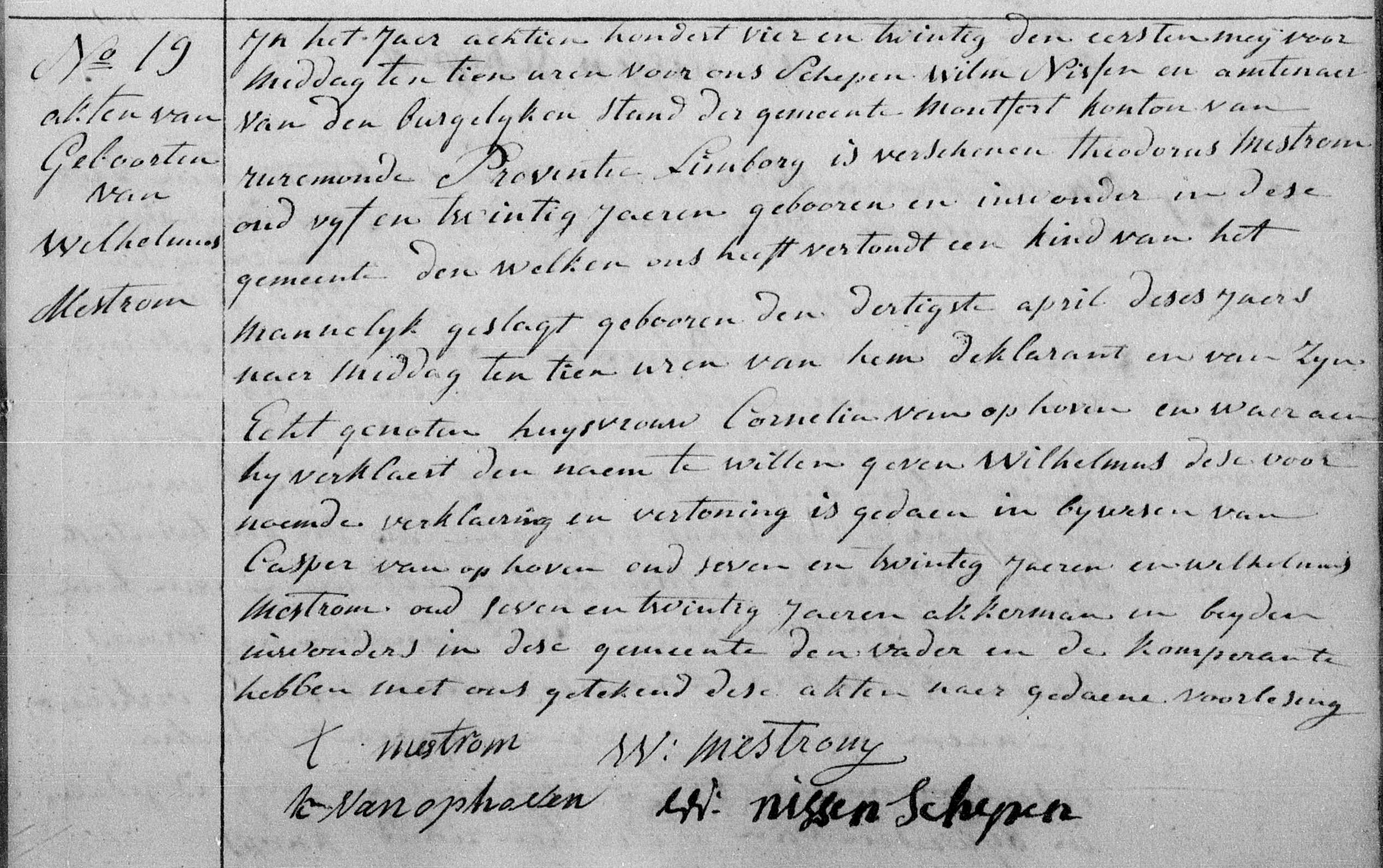 Wilhelmus Mestrom werd geboren op 30 april 1824 in Montfort als dochter van Theodorus Mestrom en Cornelia van Ophoven.
