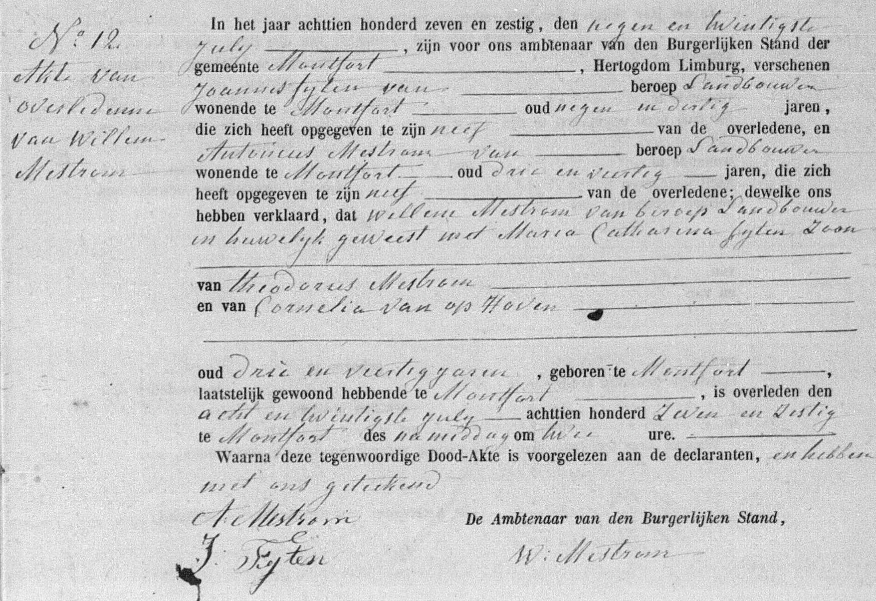 Wilhelmus Mestrom, geboren op 30 april 1824 te Montfort✔, dochter van Theodorus Mestrom en Cornelia van Ophoven; trouwt met Maria Catharina Fyten voor de wet op 22-11-184 te Monfort✔, overleden op 28 juli 1867 te Montfort✔.