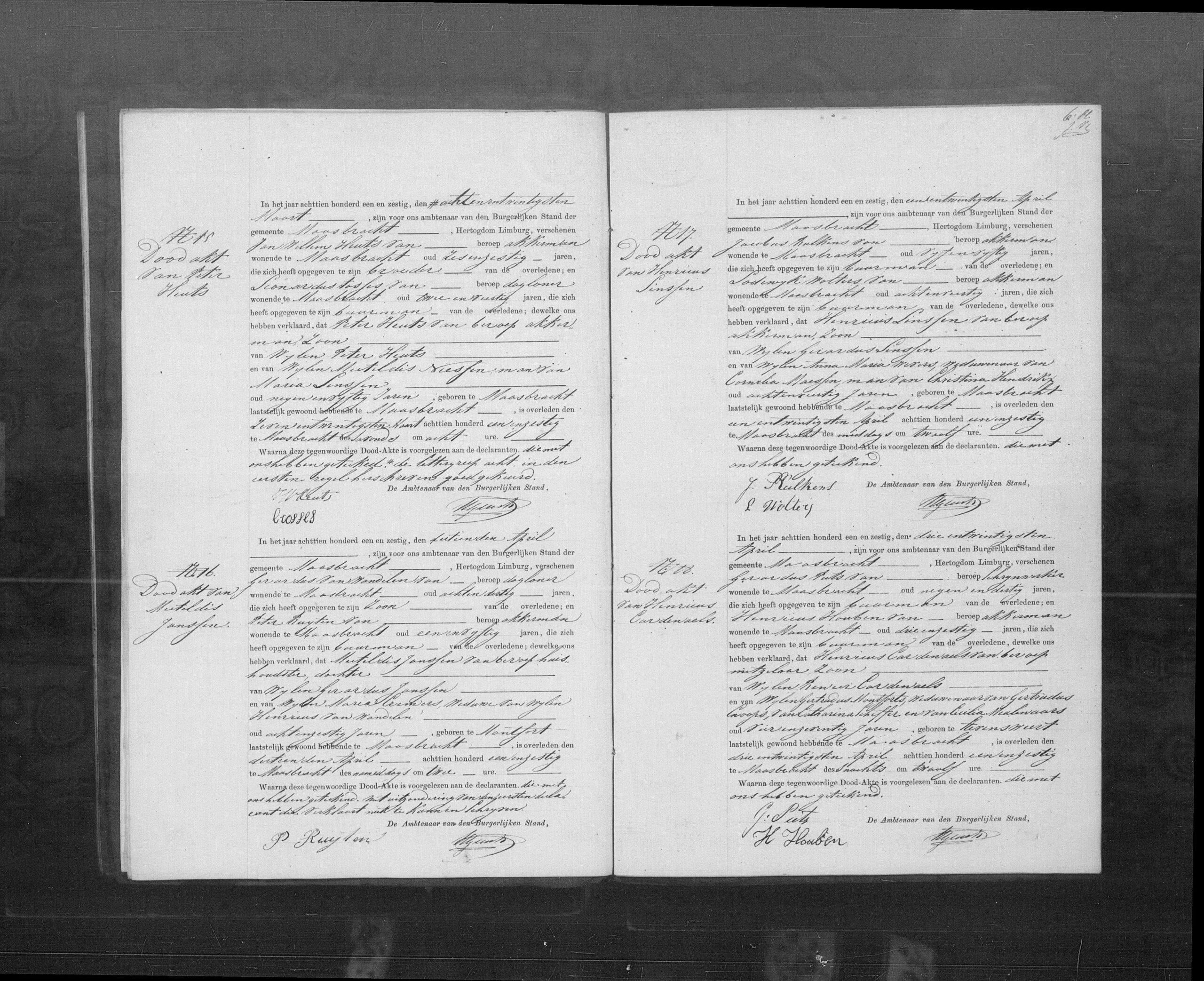 Aangevers: Jan Willem Heuts, 66 jaar oud, akkerman uit Maasbracht, broer van de overledene en Leonardus Stasses, 32 jaar oud, dagloner uit Maasbracht, buur.