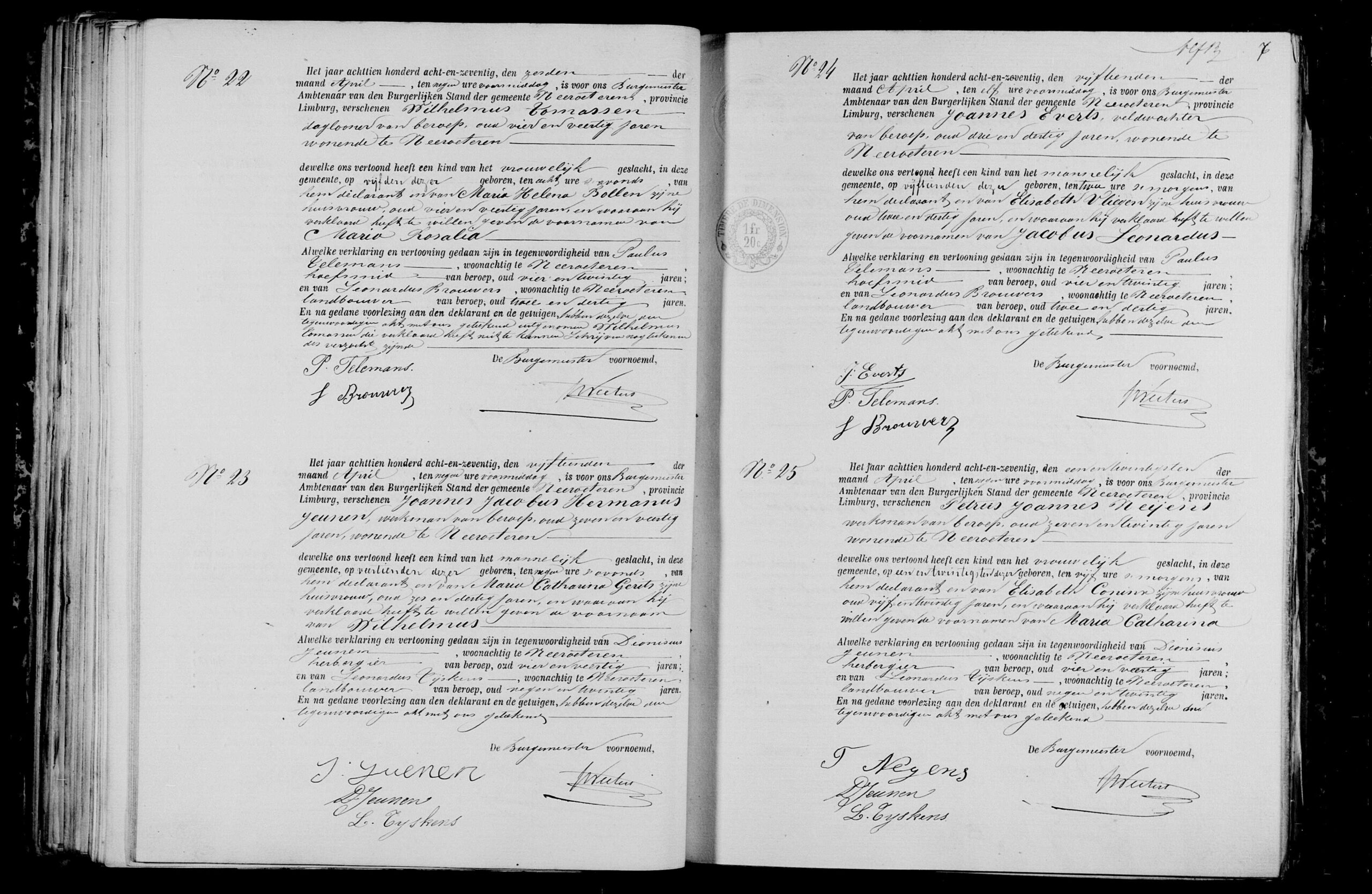 Getuigen: Paulus Telemans, 24 jaar oud, hoefsmid uit Neeroeteren en Leonardus Brouwers, 32 jaar oud, landbouwer uit Neeroeteren.