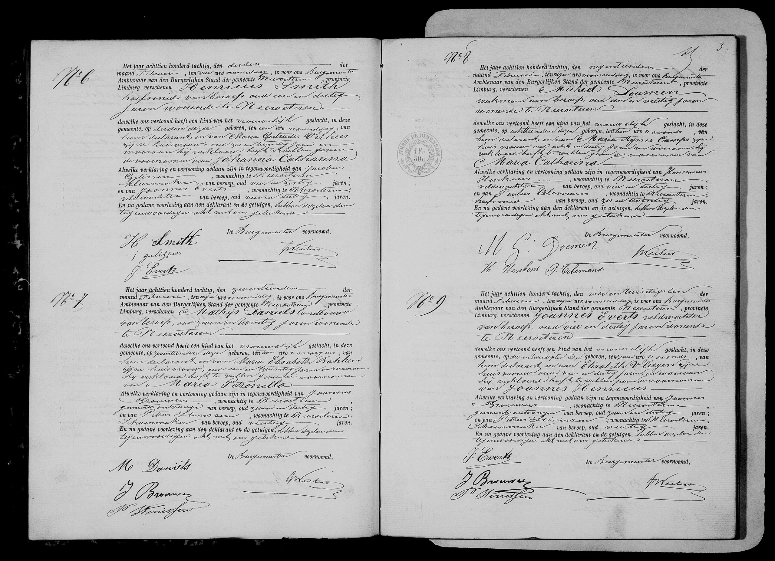 Getuigen: Joannes Brouwers, 37 jaar oud, gemeenteontvanger uit Neeroeteren en Petrus Stinissen, 40 jaar oud, schoenmaker uit Neeroeteren.
