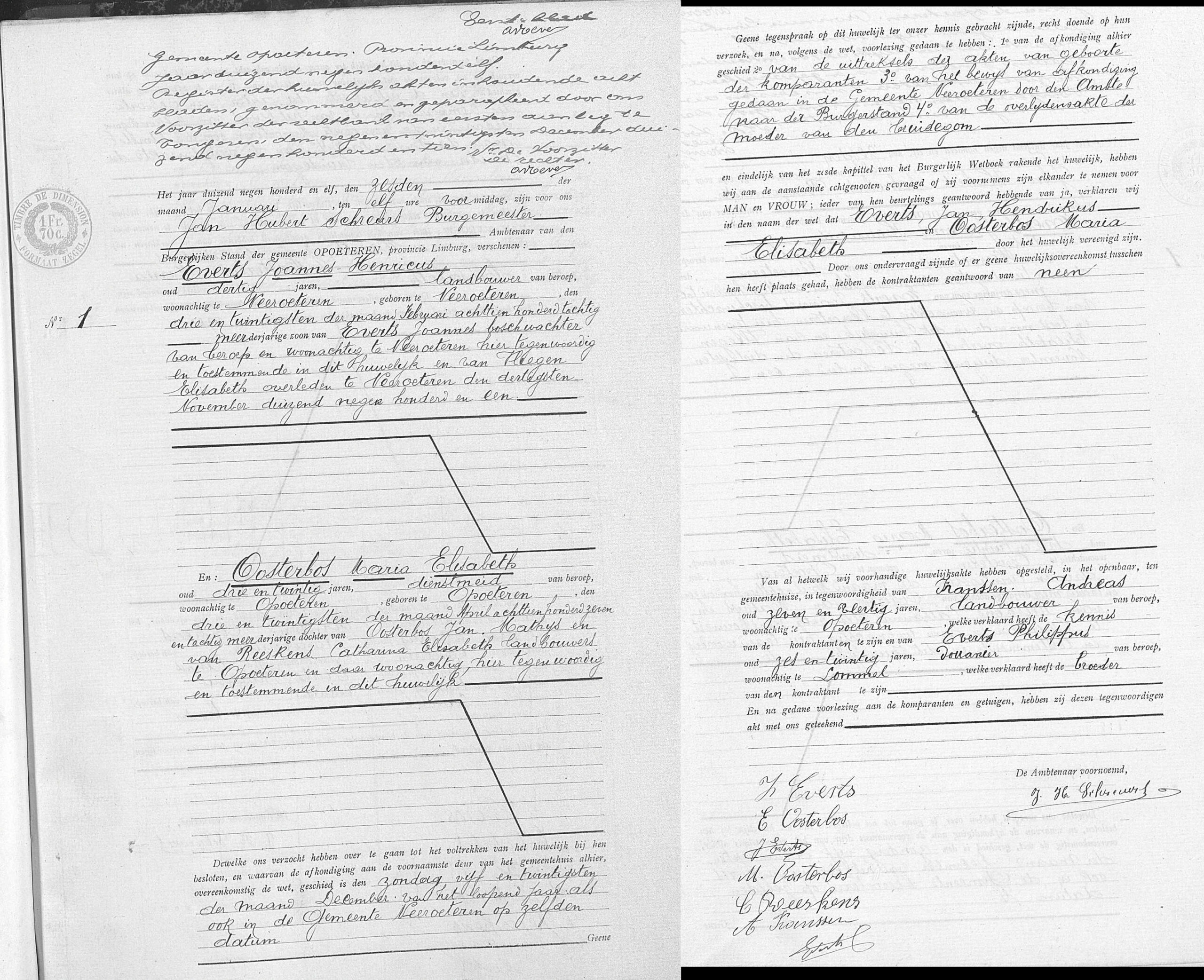 Getuigen: Andreas Franssen, 47 jaar oud, landbouwer uit Opoeteren en Philippus Everts, 26 jaar oud, douanier uit Lommel, broer van de bruidegom.