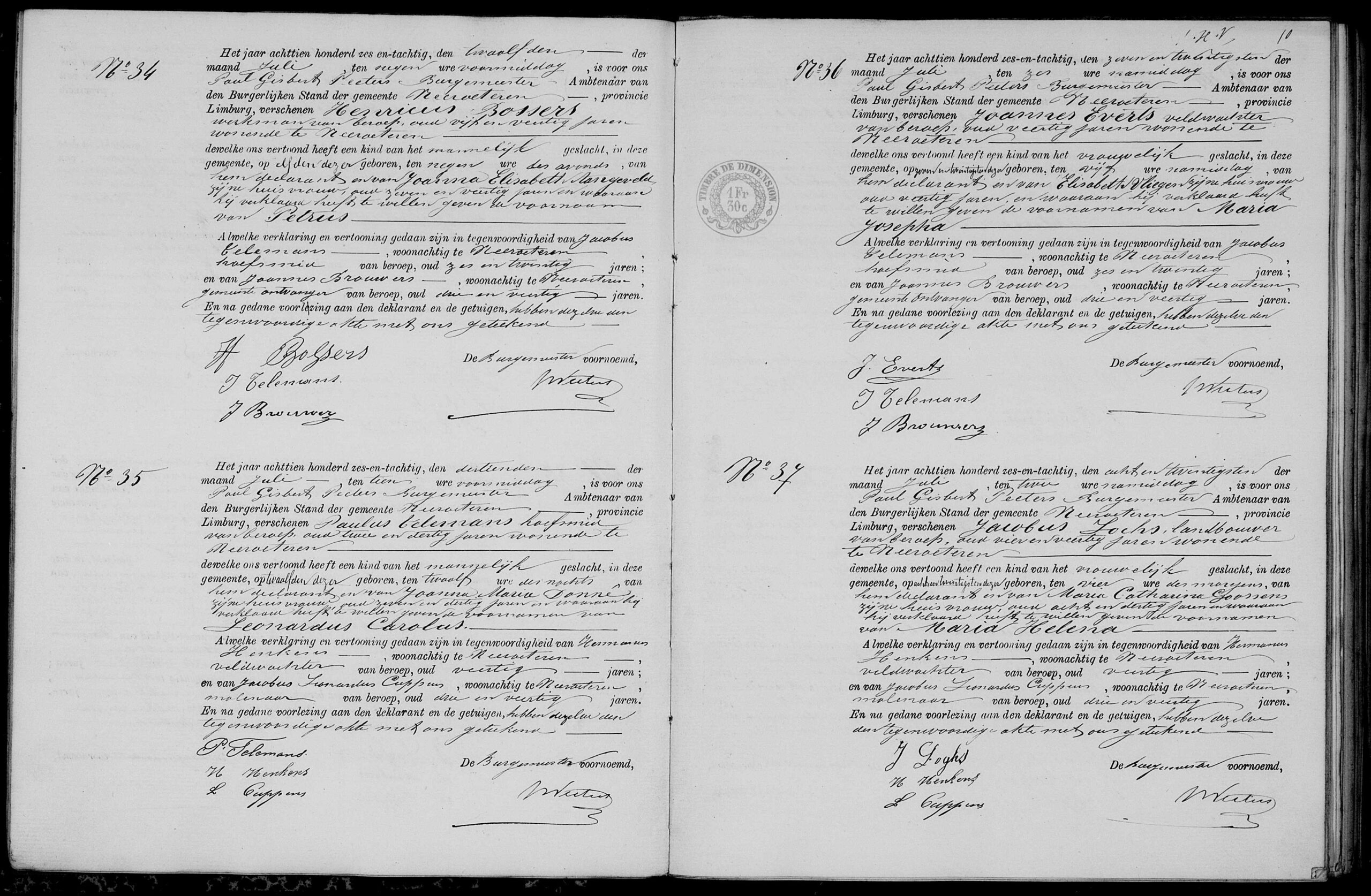 Getuigen: Jacobus Telemans, 26 jaar oud, hoefsmid uit Neeroeteren en Joannes Brouwers, 43 jaar oud, gemeenteontvanger uit Neeroeteren.