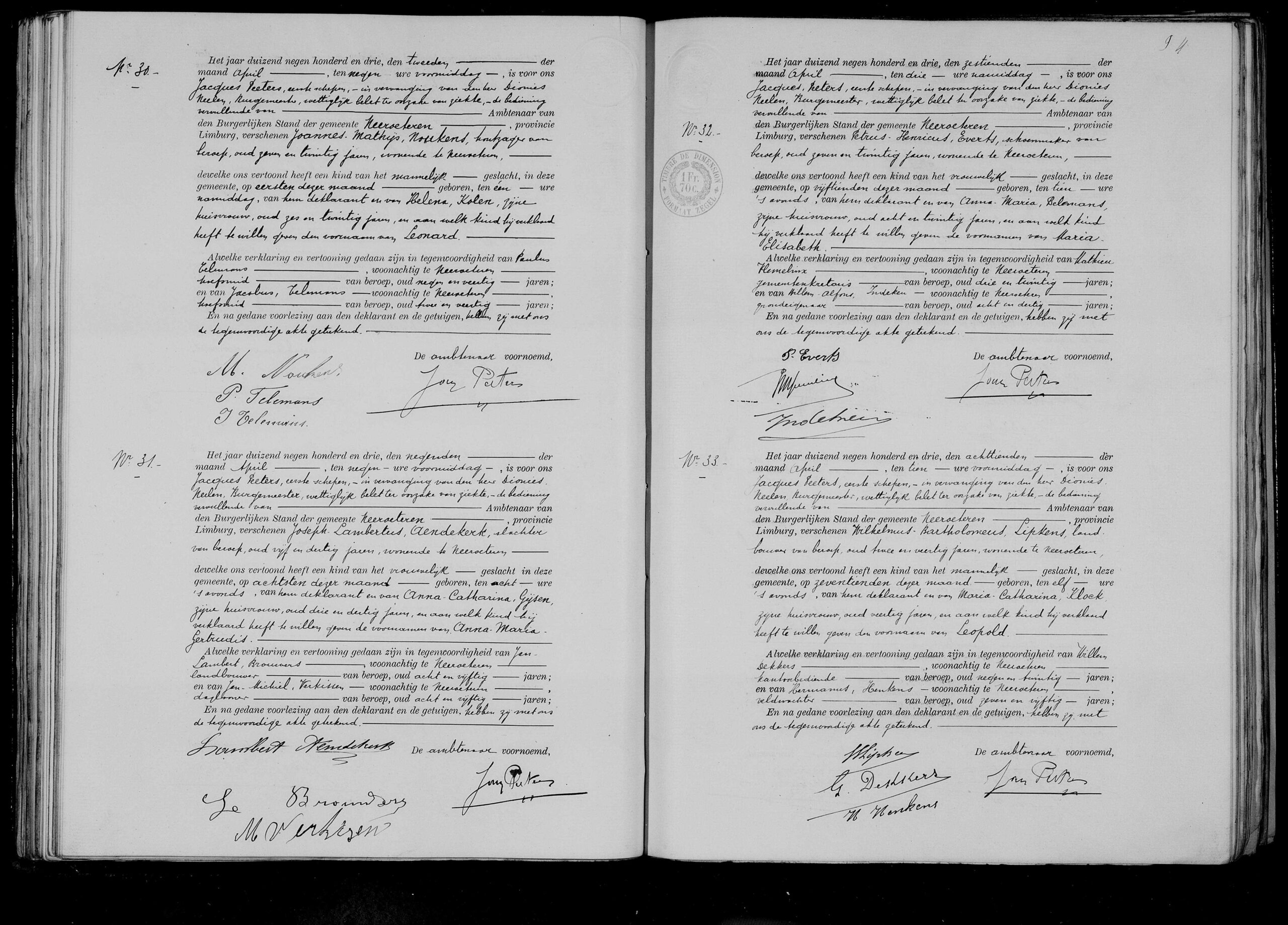Getuigen: Mathieu Hemelinx, 23 jaar oud, gemeentesecretaris uit Neeroeteren en Willem Alfons Indeken, 38 jaar oud, grondeigenaar uit Neeroeteren.
