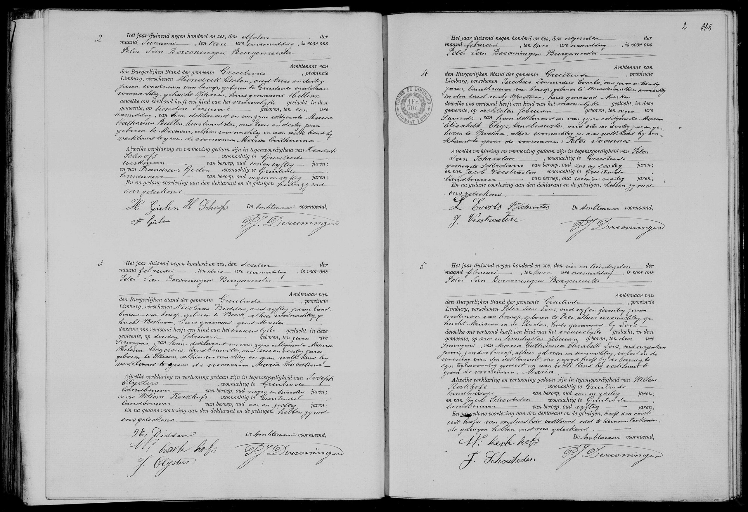 Getuigen: Peter Jan Schrooten, 66 jaar oud, gemeentesecretaris uit Gruitrode en Jacob Veestraeten, 47 jaar oud, landbouwer uit Gruitrode.