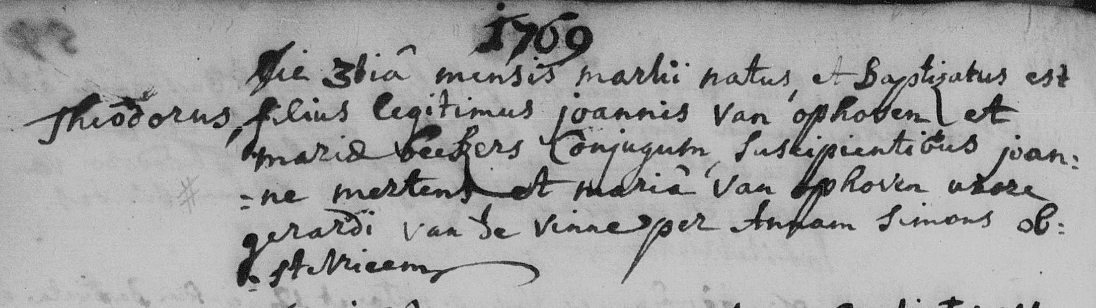 Theodorus van Ophoven werd gedoopt op 3 maart 1769 in Montfort als zoon van Joannes van Ophoven en Maria Beckers.