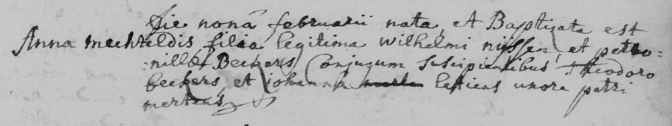 - Doopgetuigen: Theodorus Beckers, wellicht oom Derick Beckers langs moederszijde, en Joanna Leitiens, wellicht een nichtje, dochter van tante Anna Nijssen, langs vaderszijde.