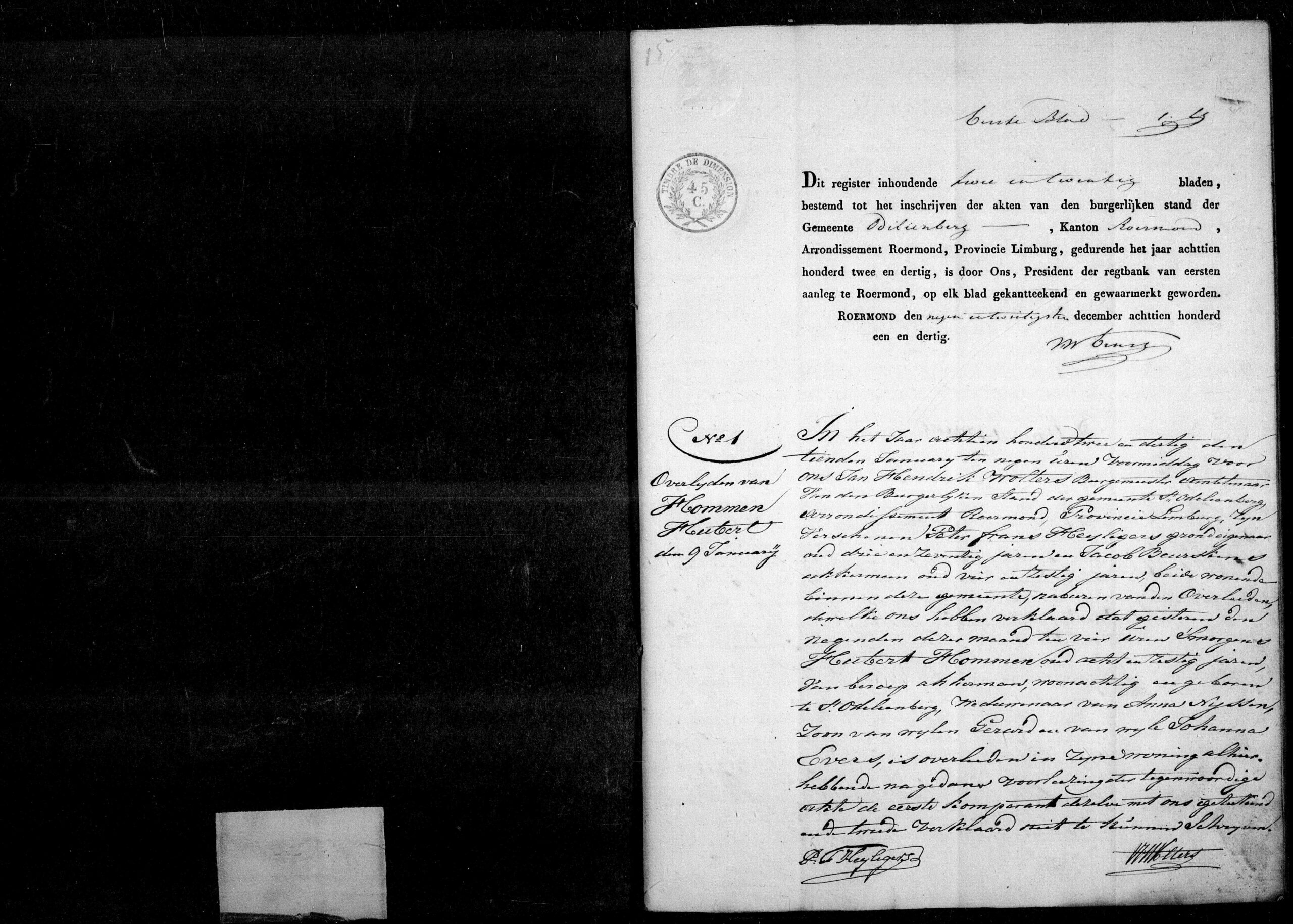 Getuigen: Henricus Hommen, uit Sint Odiliënberg en Gertrudis Nyssen, uit Beegden.