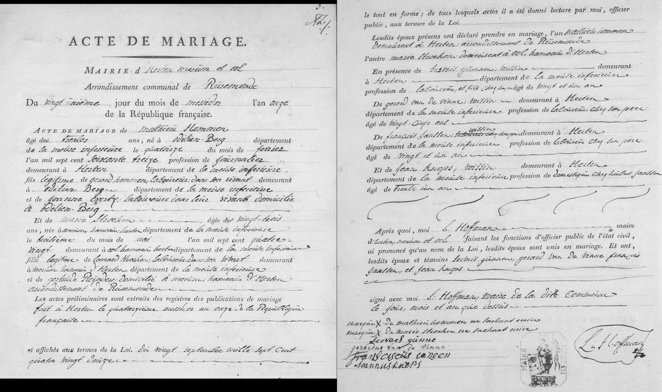 Getuigen: Servais Gunnen, 21 jaar oud, landbouwer, buur en Gerard van de Vinne, 25 jaar oud, landbouwer, buur en François Janssen, 21 jaar oud, landbouwer, buur en Jean Knops, 31 jaar oud, dienstbode, buur.