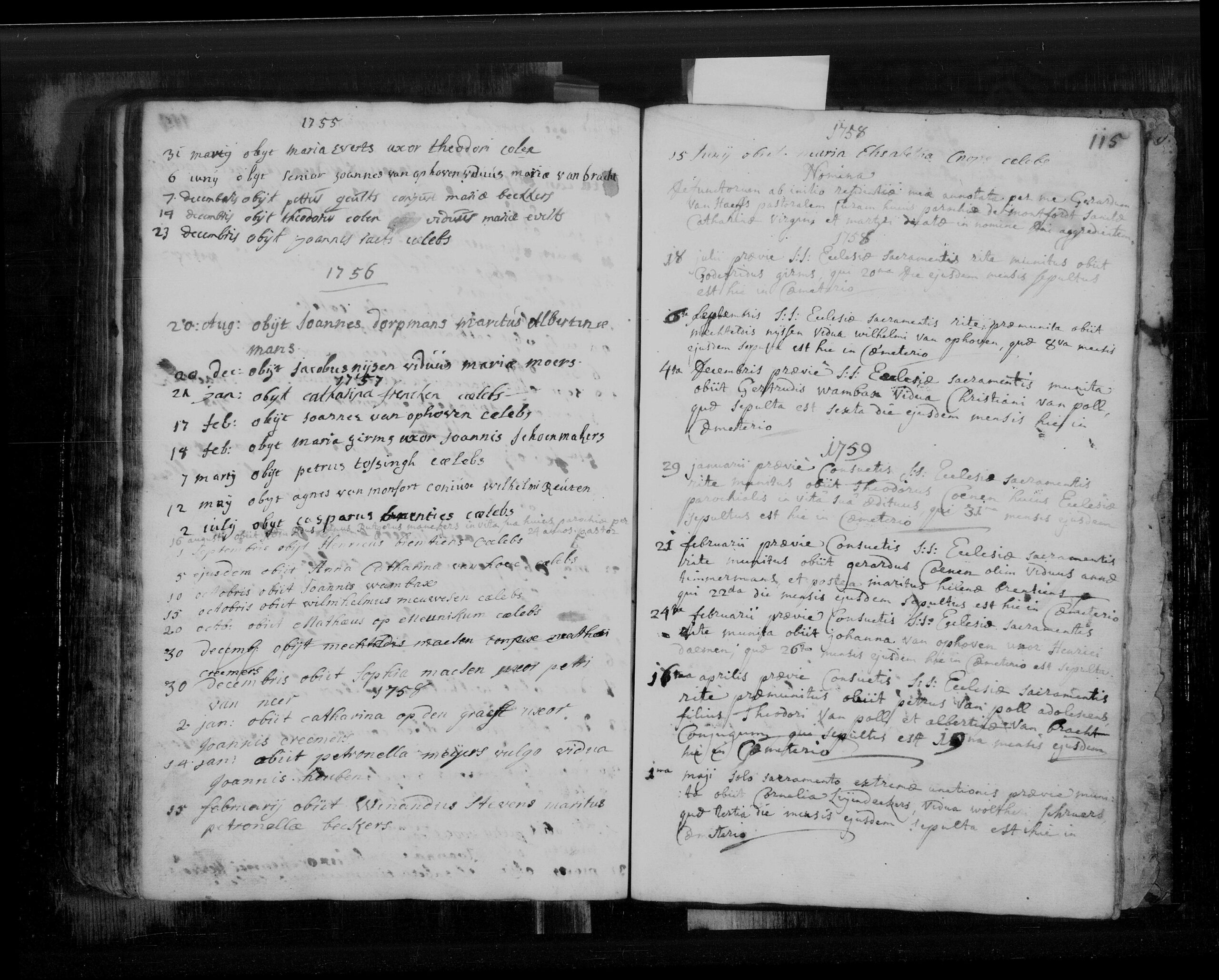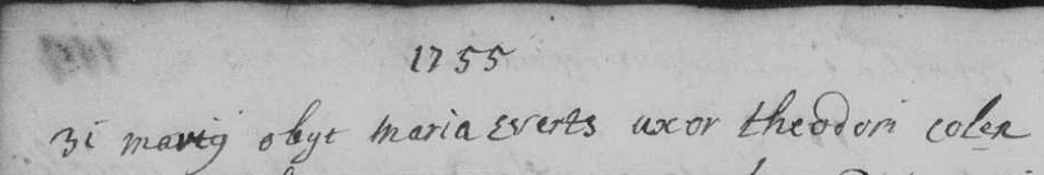 Inschrijving in het overlijdensregister: 1755 Op 31 maart is overleden Maria Everts, echtgenote van Theodorus Colen.