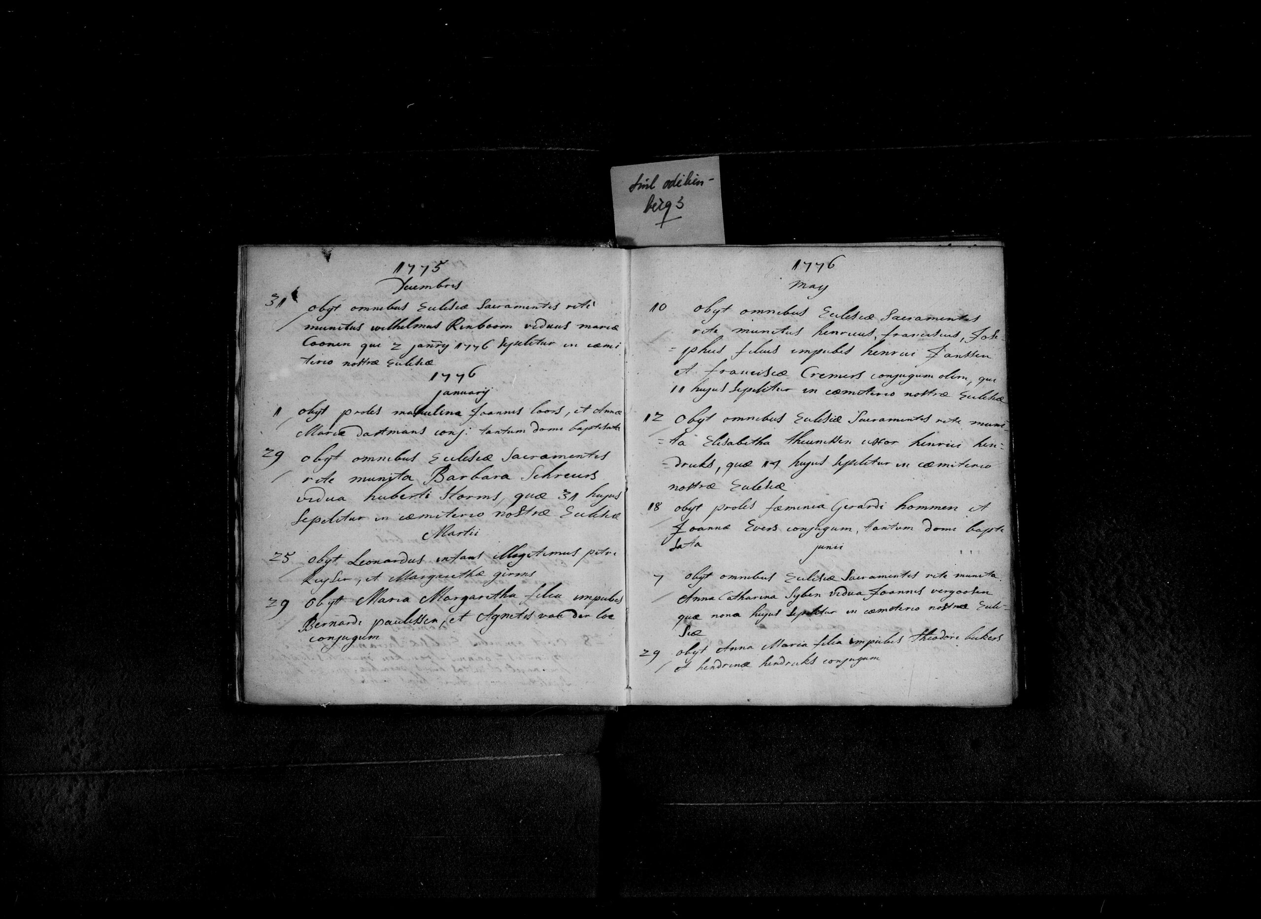 - Op 18 mei is overleden een vrouwelijk kind van de echtlieden Gerardus Hommen en Joanna Evers, dat slechts thuis was gedoopt. Wellicht werd het kind dus ook geboren op 18/5. Omdat het kind alleen thuis gedoopt is, is het doopsel niet geregistreerd in het doopregister.