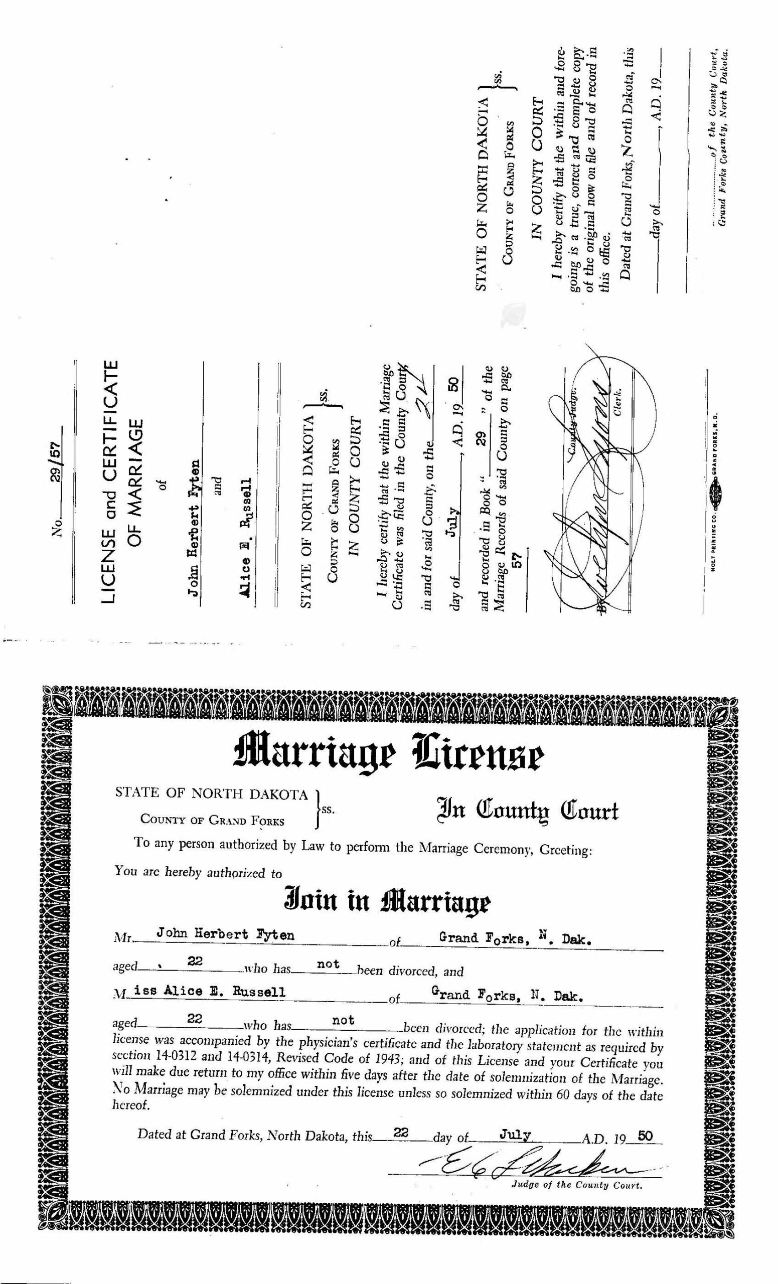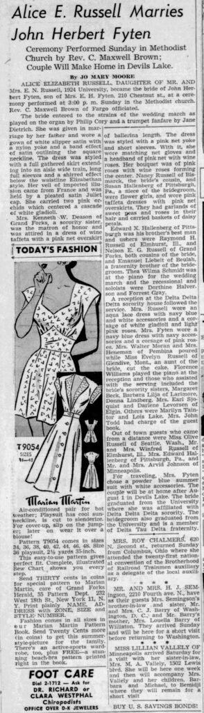 Terwijl de wereld langzaam herstelde van de oorlogsjaren en de economie in North Dakota weer opbloeide, vierde de familie Fyten in de zomer van 1950 een gebeurtenis die in de lokale kranten breed werd uitgemeten. Op de namiddag van zondag 23 juli, om exact drie uur, openden de deuren van de Methodistische kerk in Grand Forks zich voor het huwelijk van de 22-jarige John Herbert Fyten en zijn eveneens 22-jarige bruid Alice Elizabeth Russell.