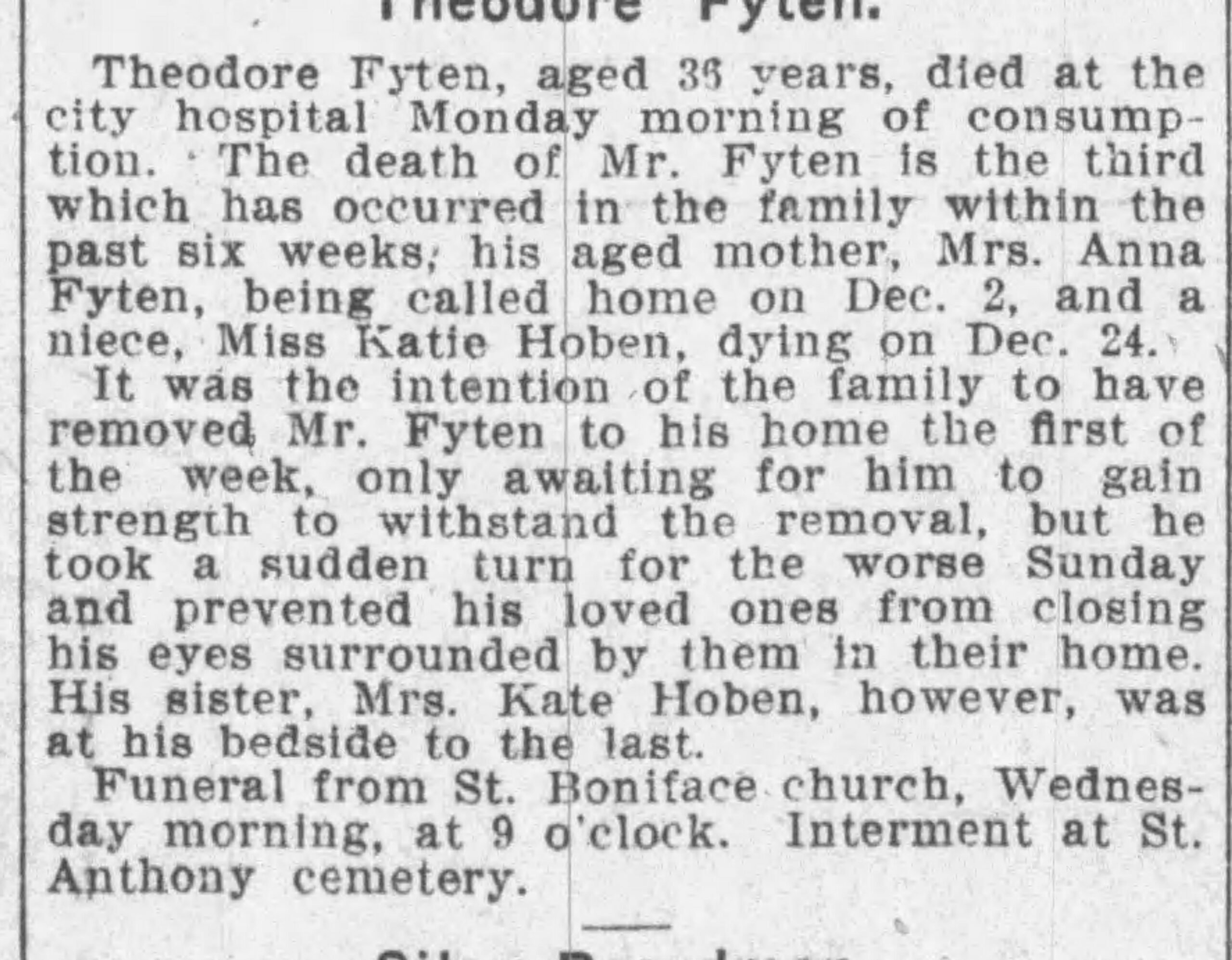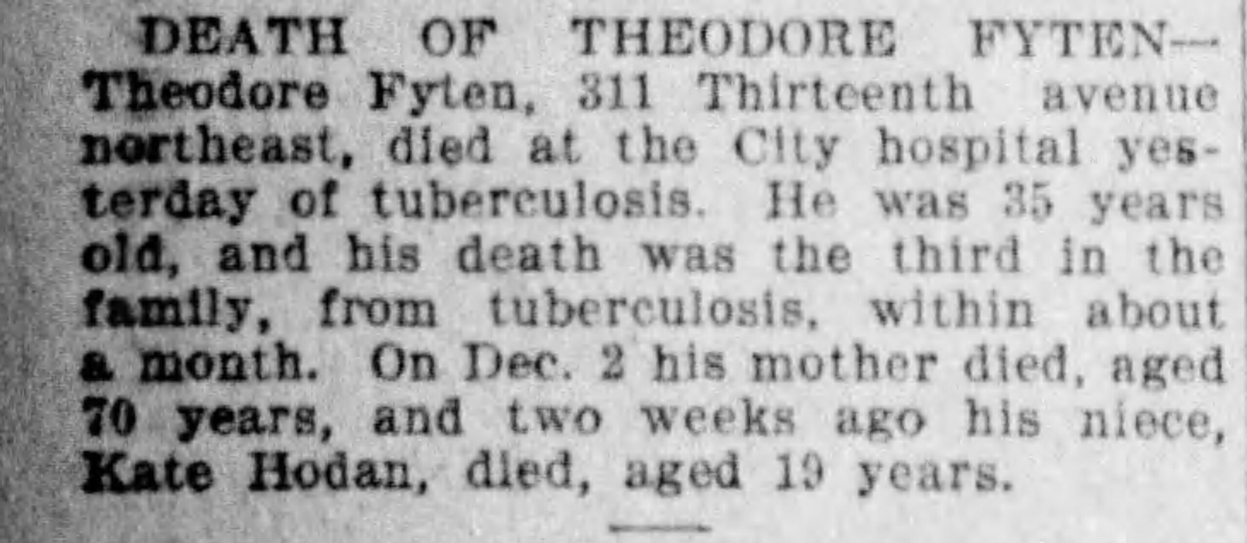 Terwijl de familie nog rouwde om de dood van een moeder en een kleindochter, lag Catharina's broer Theodorus Fyten doodziek in het City Hospital. Theodorus, destijds 35 jaar oud en wonend aan 311 Thirteenth Avenue Northeast, vocht eveneens tegen tuberculose.