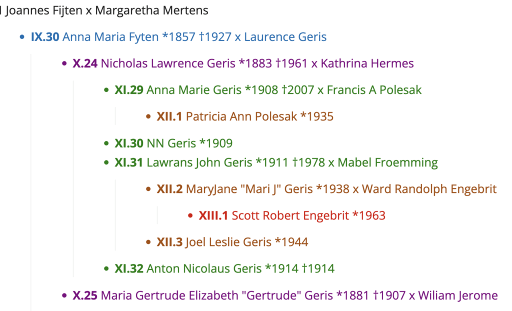 De naam 'Fijten' transformeerde definitief naar 'Fyten', en door huwelijken kwamen er nieuwe, stevige familietakken bij met namen als Geris, Eull, Babler en Hoban. De nakomelingen volgden het ritme van de Amerikaanse expansie.