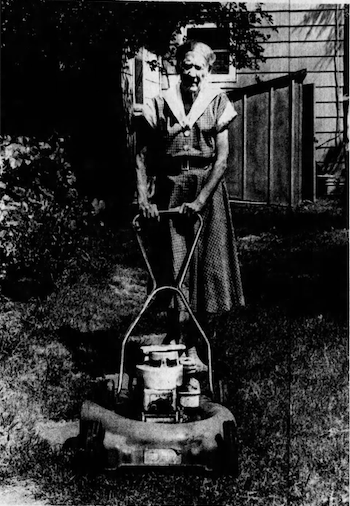 [Ruimte voor afbeelding: Een van de krantenfoto's van de 93-jarige Edla met haar grasmaaier of in haar tuin]