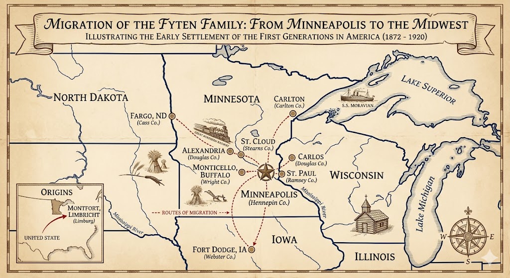 Wanneer we de stamboom van de familie Fijten na de eerste decennia in Amerika overzien, zien we een klassiek patroon van de pioniersgeschiedenis. Het gezin dat in 1872 vanuit Montfort de oceaan overstak en in 1880 in de fabrieksstad Minneapolis (Hennepin County) belandde, bleef daar niet stilzitten. Zodra de kinderen van John en Margaret volwassen werden, waaierden ze uit.