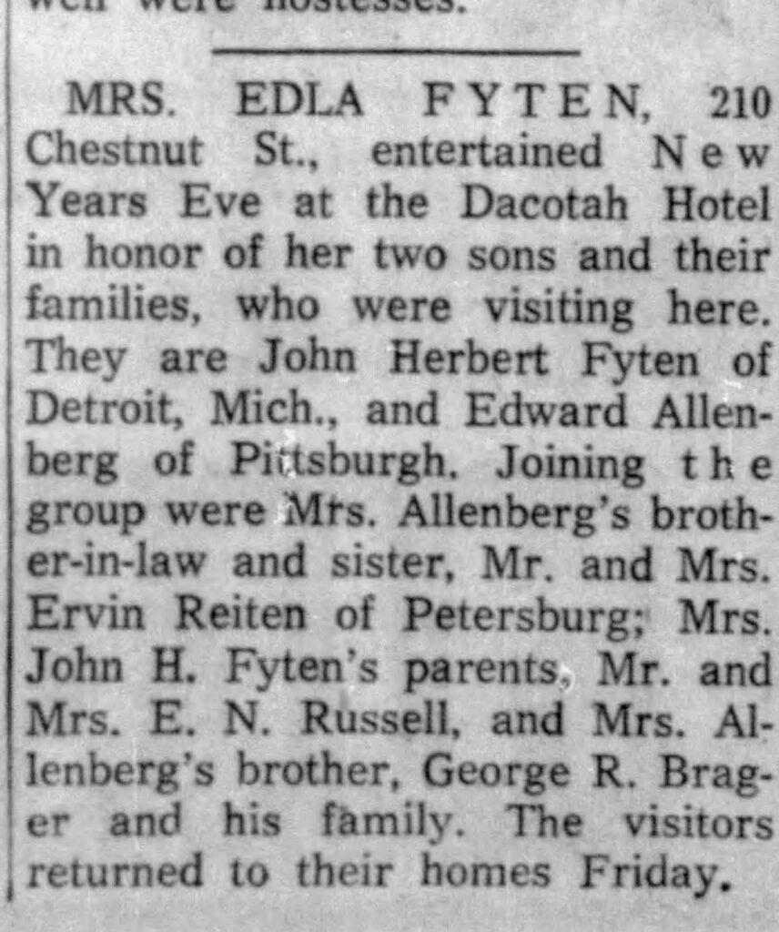 MEVR. EDLA FYTEN, 210 Chestnut St., gaf op oudejaarsavond een feest in het Dacotah Hotel ter ere van haar twee zonen en hun gezinnen, die hier op bezoek waren. Het zijn John Herbert Fyten uit Detroit, Mich., en Edward Allenberg (let op: typefout van de krant, dit is Hallenberg) uit Pittsburgh. Ook bij de groep aanwezig waren de zwager en zus van mevrouw Allenberg, de heer en mevrouw Ervin Reiten uit Petersburg; de ouders van mevrouw John H. Fyten, de heer en mevrouw E. N. Russell, en de broer van mevrouw Allenberg, George R. Brager en zijn gezin. De bezoekers keerden vrijdag terug naar huis.