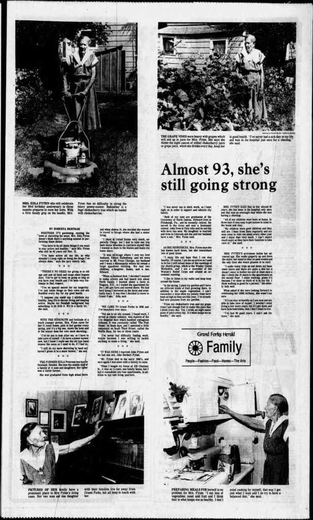 TERWIJL ZE HERINNERINGEN OPHAALT, zegt mevrouw Fyten dat ze zware tijden heeft gekend, maar ze herinnert zich ook veel goede tijden. "Ik geniet van het leven en hoop dat ik gezond kan blijven. Natuurlijk ben ik niet meer zo actief als vroeger, maar ik woon nog steeds een paar bijeenkomsten van mijn kerkgroep bij, de Wesley United Methodist, en ik ben lid van de Woman's Relief Corps en woon af en toe een vergadering bij. "Ik luister graag naar mijn radio en blijf bezig in huis. "In de lente plant ik mijn tuin en ik heb daar zes verschillende soorten fruit groeien, naast de basisgroenten. Ik kan me geen tijd herinneren dat mijn aardappelplanten zo hoog stonden als dit jaar. Ik heb al nieuwe aardappelen uit mijn tuin gehad. "Van mijn Amerikaanse kersenboom [chokecherry tree] en mijn wijnranken krijg ik genoeg fruit om het sap te maken dat ik elke dag drink. Ja, ik drink elke dag een glas sap van acht ounce [ca. 240 ml]. Dat is wat me zo gezond houdt," zegt ze.