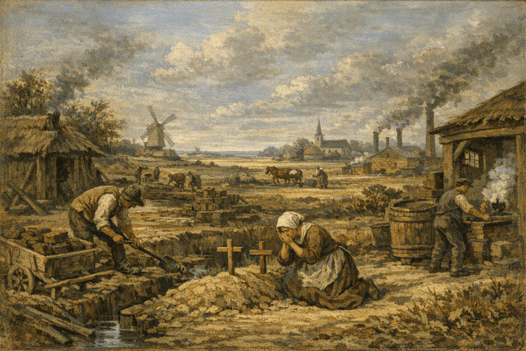 De omslag kwam in 1916. Het gezin was verhuisd naar de Nieuwstraat in Nederweert, dichter bij de kern, maar de sociale status van Heinrich veranderde op papier. Bij de aangifte van zijn dochter Engelina Hendrina in december 1916 stond er niet langer 'landbouwer' onder de akte, maar veenarbeider. De droom van de boerderij had plaatsgemaakt voor de realiteit van de turfsteker: in het voorjaar turven steken, in de zomer drogen en opzetten. Het was seizoenswerk, betaald per stuk, waarbij elke hand – ook die van vrouwen en oudere kinderen – nodig was.